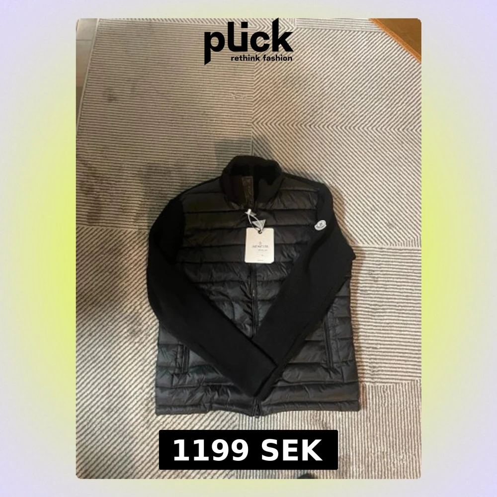 Säljer en svart pufferjacka från Moncler med stickade ärmar och quiltad kropp. Jackan har dragkedja framtill, hög krage och två fickor med dragkedja. Klassisk Moncler-logga på ärmen. Perfekt för dig som vill ha en clean och stilren look.