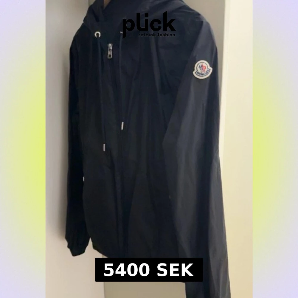Svart vindjacka från Moncler med huva och snygga vita och röda ränder på insidan av huvan. Jackan har dragkedja framtill, snörning vid huvan och Moncler-logga på ärmen. Materialet är lätt och glansigt, perfekt för blåsiga dagar. Inte använt den mycket alls köpte den i september