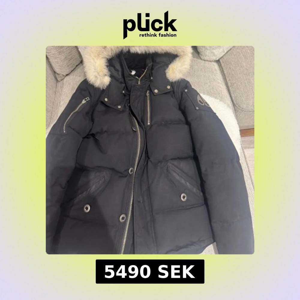 Säljer en svart dunjacka från Moose Knuckles med fluffig päls på huvan, coola metalldetaljer och dragkedjor. Jackan har flera fickor med knappdetaljer och snyggt broderat märke på insidan. Perfekt för dig som vill ha en varm och stilren look i vinter. Ny pris 13000kr köpt på jb