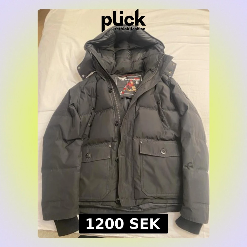 Svart dunjacka från Moose Knuckles med stor huva, ribbade muddar och flera fickor med knappar. Jackan har dragkedja och knappar framtill, samt ikonisk logga på ärmen. Perfekt för kalla dagar och har en schysst, lite loose passform. Pris kan diskuteras