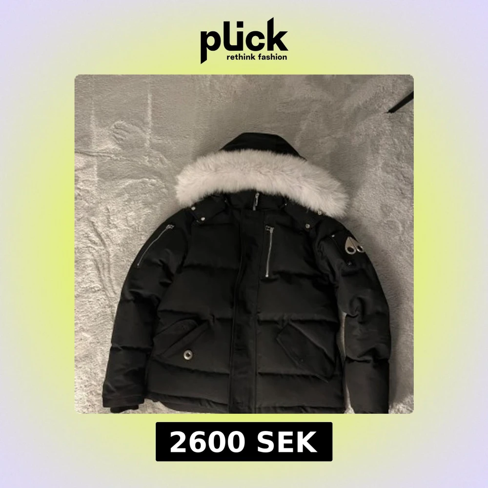 Hör av dig innan! Svart dunjacka från Moose Knuckles med vit fuskpäls på huvan, flera dragkedjor och snygga metallknappar. Jackan har broderad hockeypatch på insidan och ikonisk logga på ärmen. Perfekt för kalla dagar med sin tjocka och puffiga design.