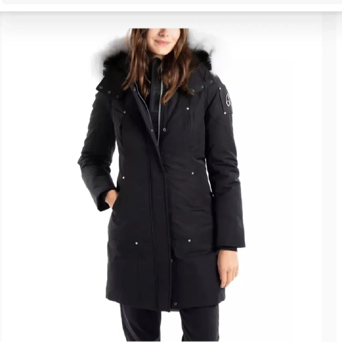 Svart moose knuckles jacka dam. Som ni kan se så har jag tejpat jackan med klädestejp pågrund av ett litet hål. Men det syns knappt i verkligheten. Vit äkta päls som är avtagbar. Vid snabb affär kan gå ner i pris.