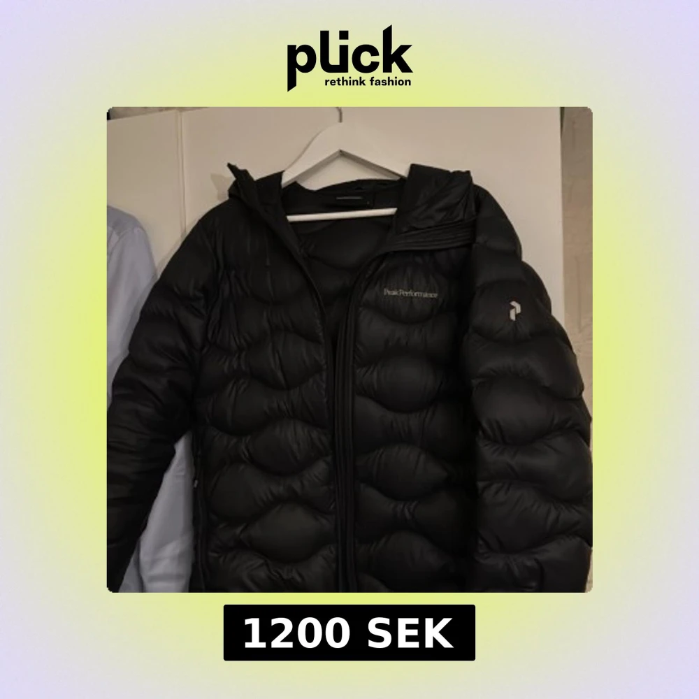 Säljer en svart/mörkblå dunjacka från Peak Performance med huva och dragkedja. Jackan har en puffig design och logga på bröstet. Perfekt för kyliga dagar och riktigt skön att ha på sig.