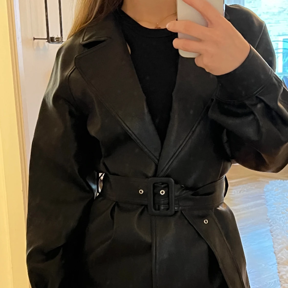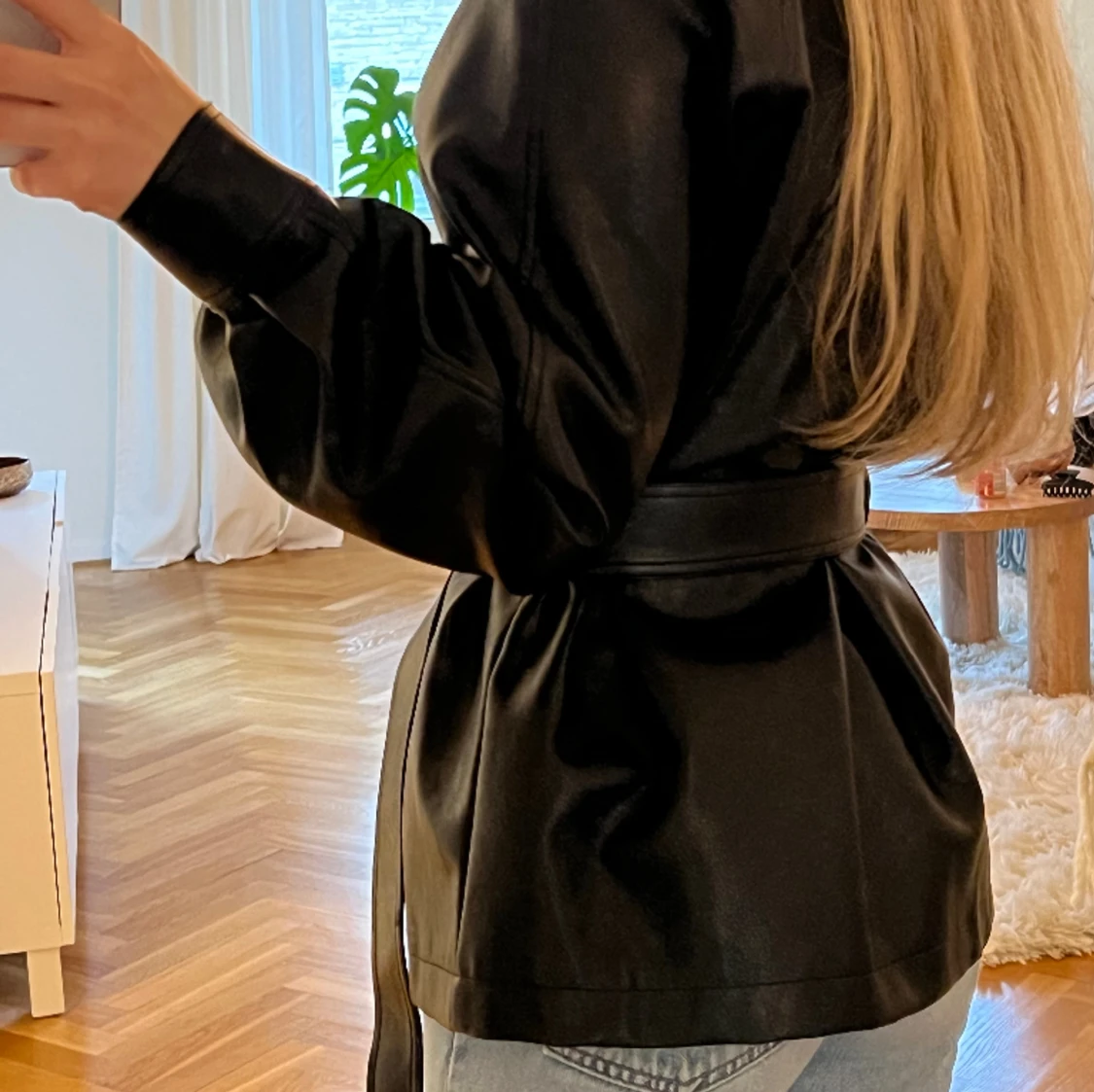 Svart skinnjacka(fakeläder) med bälte från NA-KD. Aldrig använd! Storlek EU 34. 300:- ex frakt.