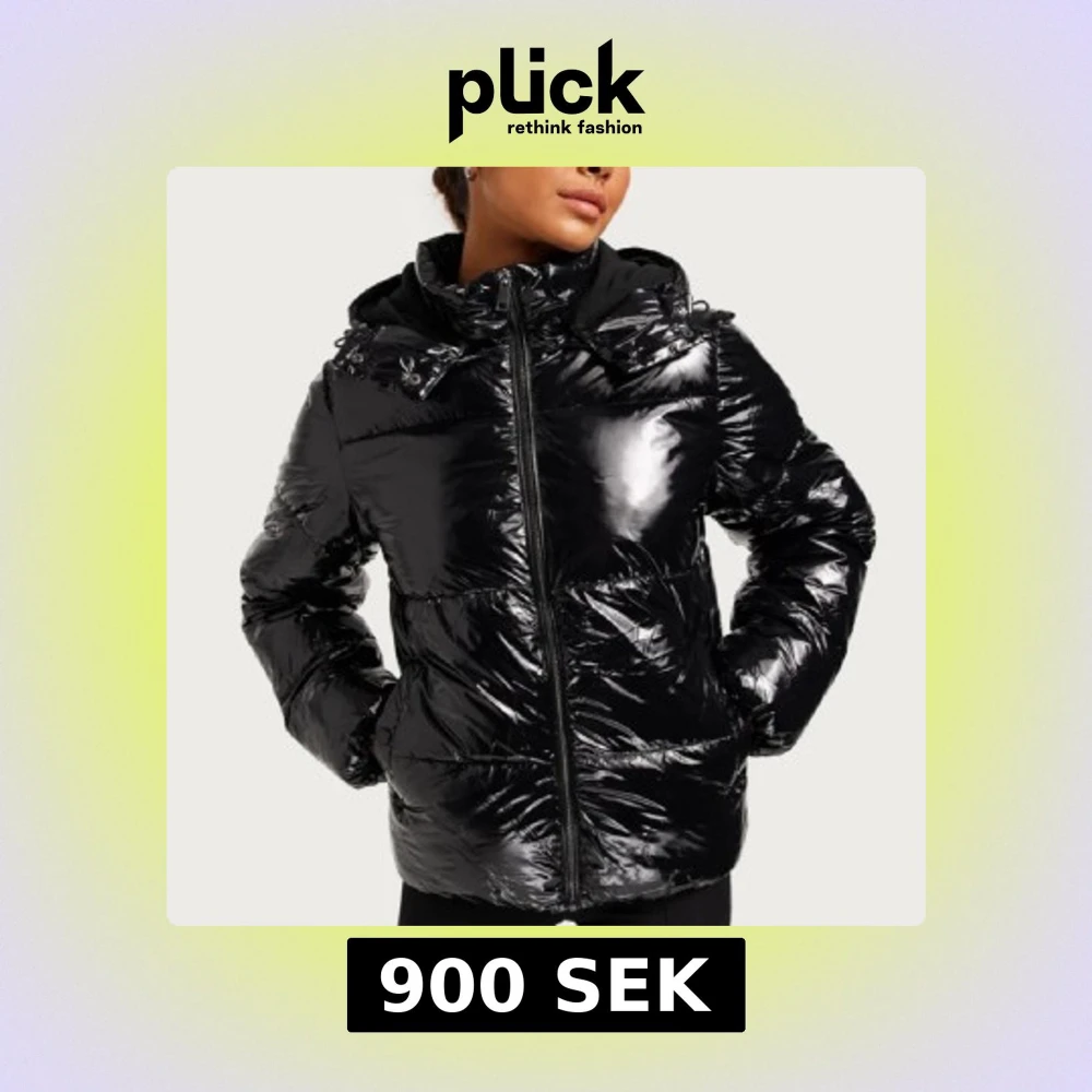 Säljer en svart, glansig pufferjacka från Nelly i storlek S. Jackan har huva, den har inge defekter