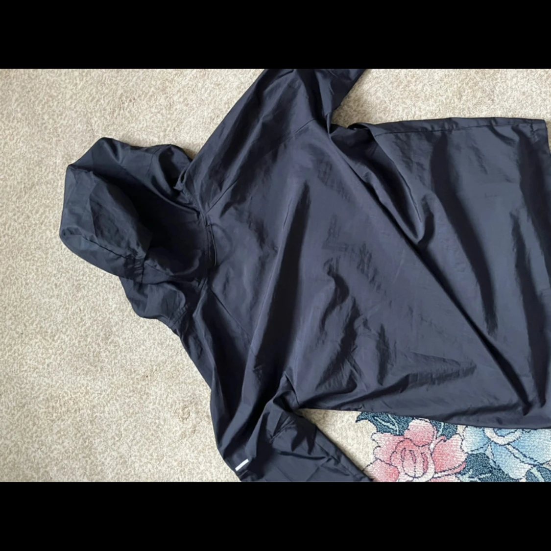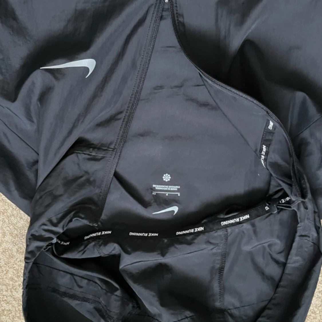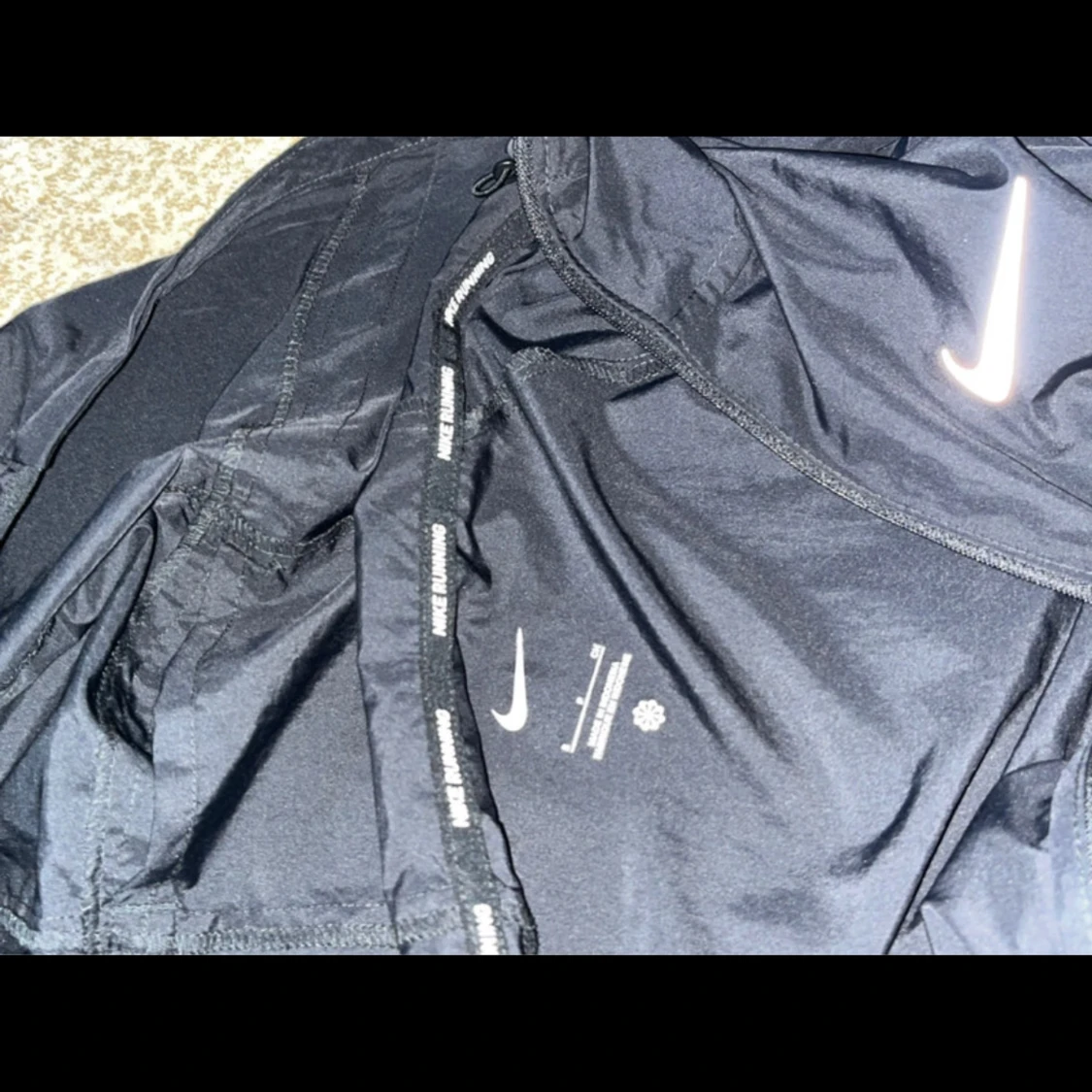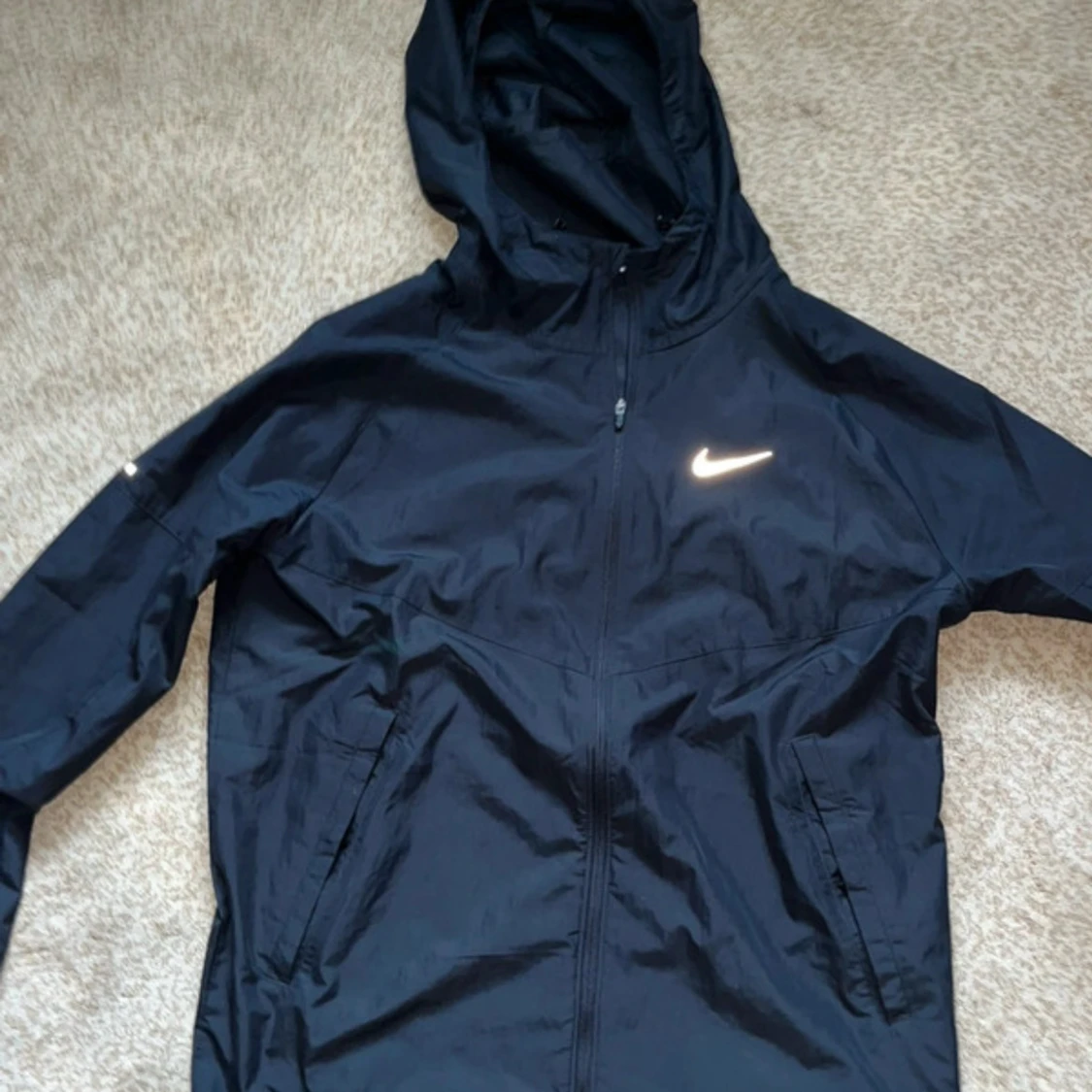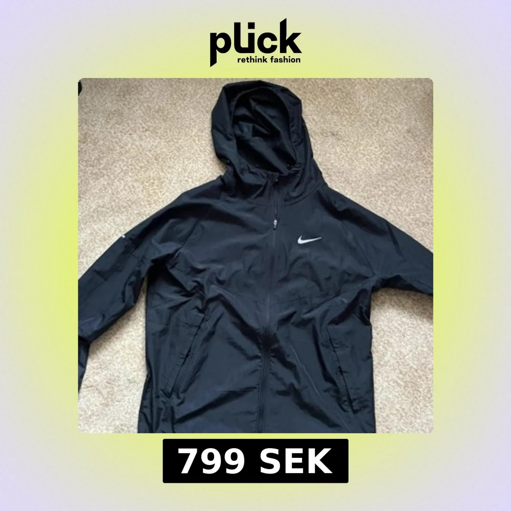 Säljer en svart vindjacka från Nike med huva och dragkedja framtill. Jackan har två sidofickor med dragkedja och en vit Nike-logga på bröstet. Tillverkad i lätt polyester, perfekt för blåsiga dagar. Snygg och sportig design som funkar året runt.