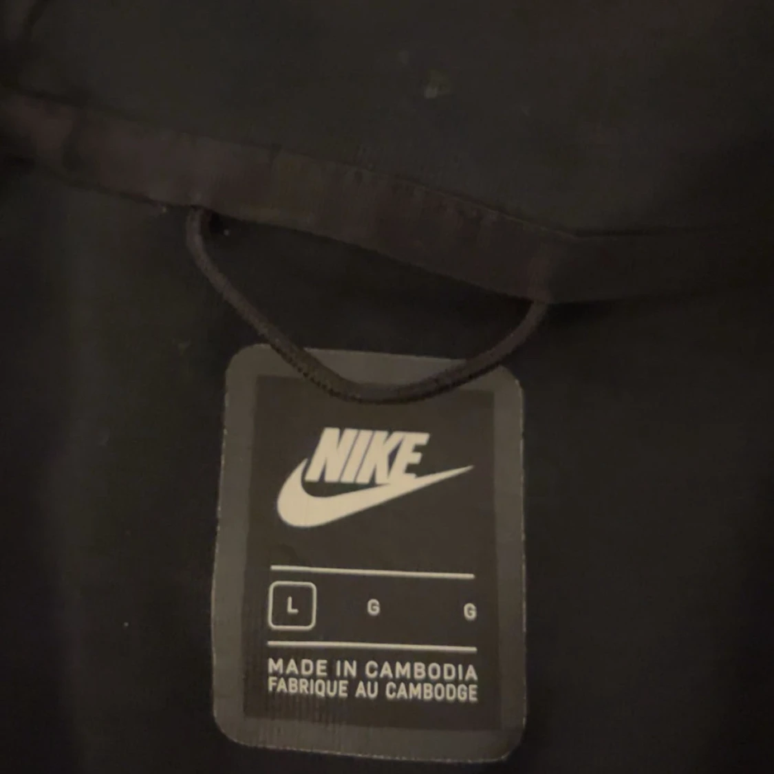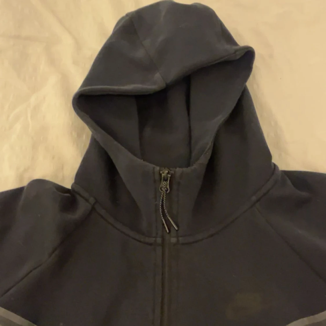 Nike hoodiejacka i svart med hel dragkedja och huva. Jackan har två fickor framtill och diskreta grå ränder över bröstet. Perfekt för chill eller träning, med sportig look och bekväm passform.