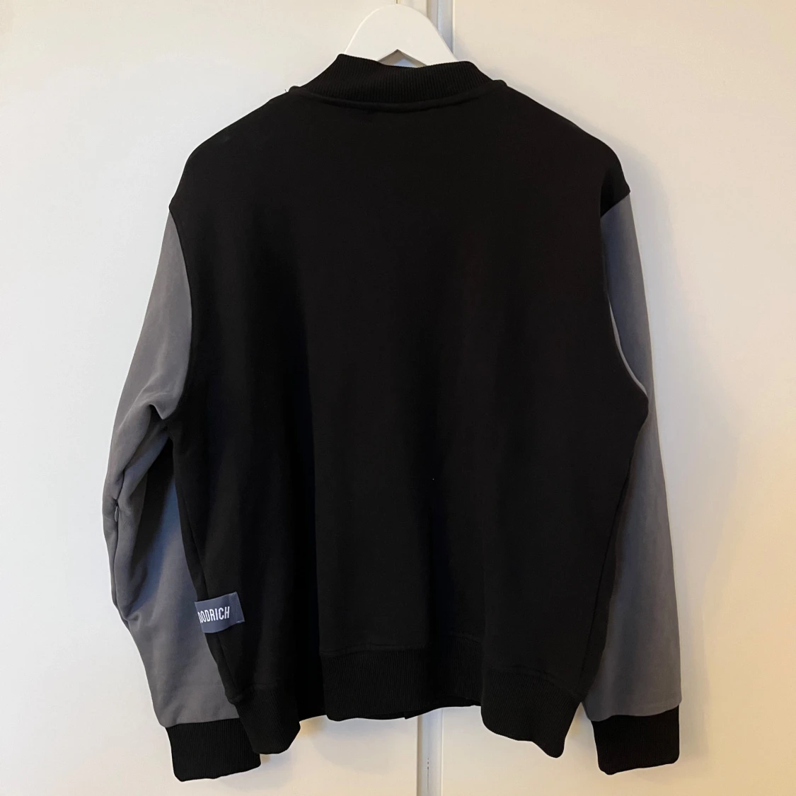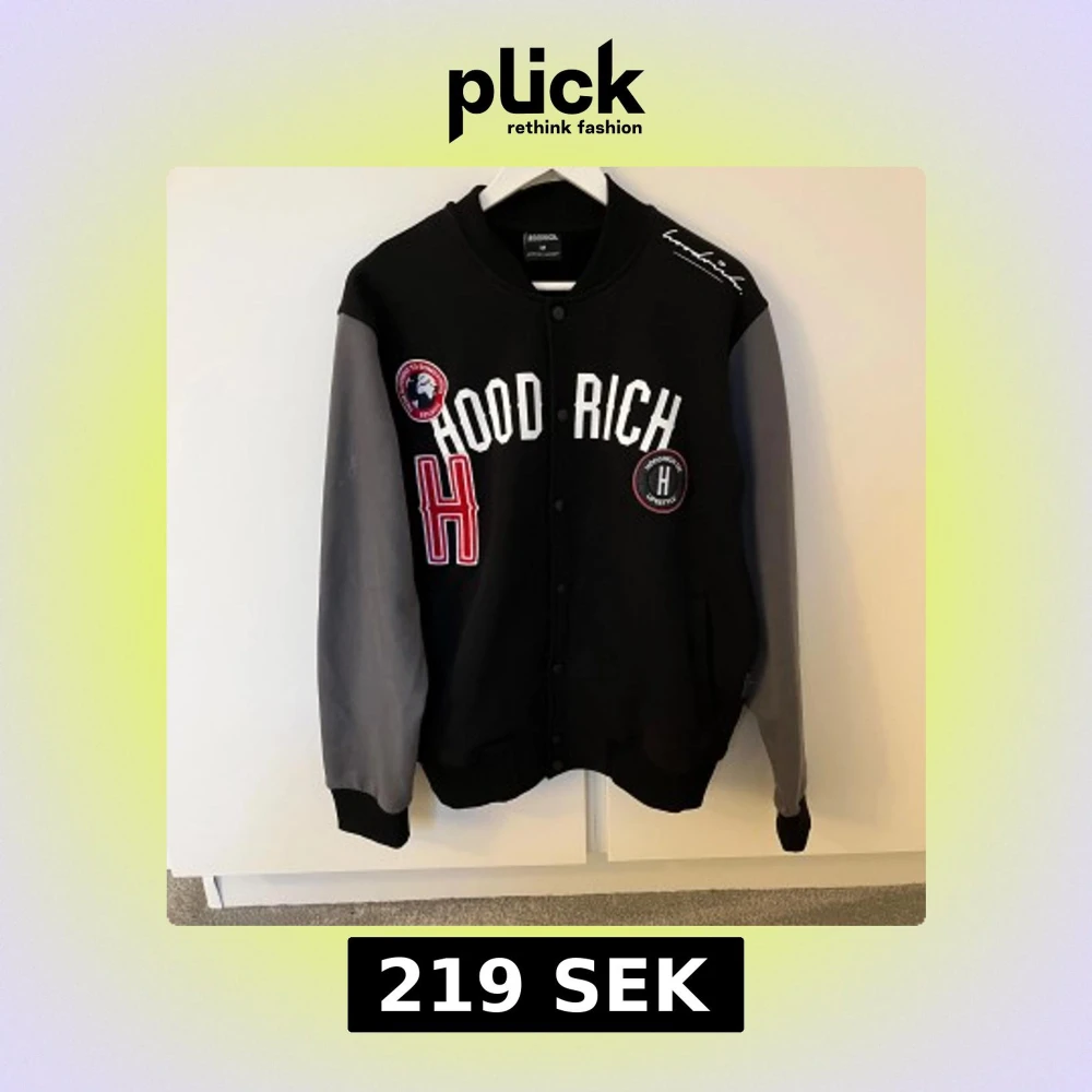 Säljer en svart och grå bomberjacka från Hoodrich med coola patches och broderade detaljer framtill. Jackan har tryckknappar, ribbade muddar och kontrastärmar i grått. Perfekt för dig som vill sticka ut med streetstyle och sportig vibe. Tröjan är bara använd en få antal gånger och är därför i bra skick!