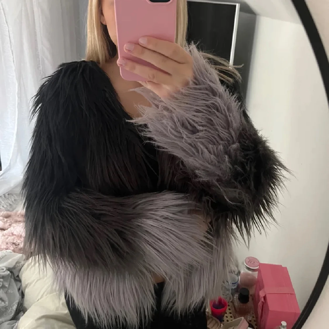 Snygg och trendig pälsjacka i svart och grått med långa ärmar. Perfekt för att sticka ut i mängden med sin fluffiga design. Jackan har en modern look och passar bra till olika tillfällen.
