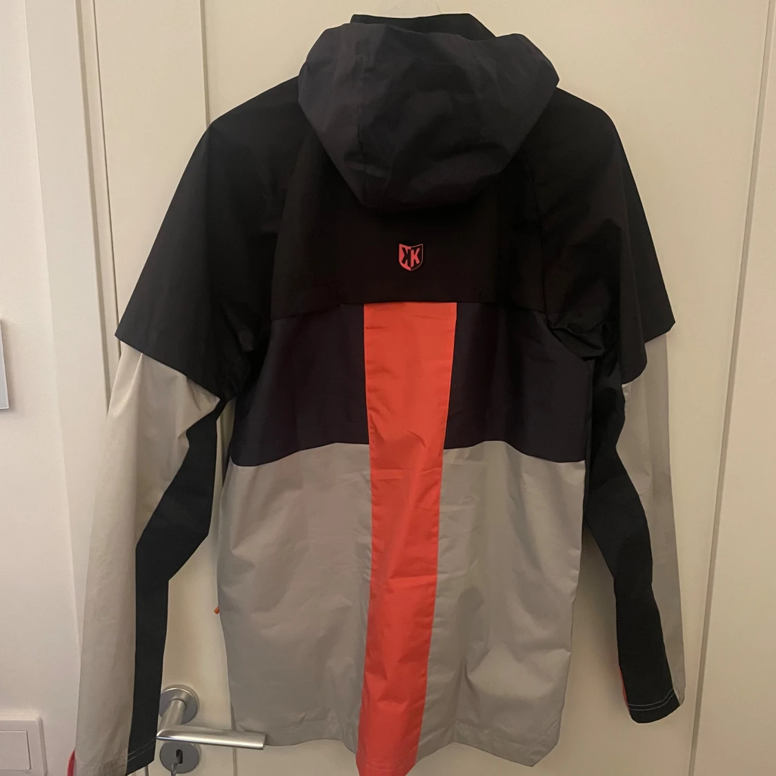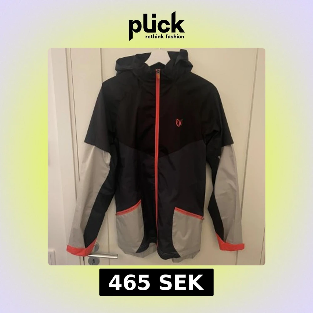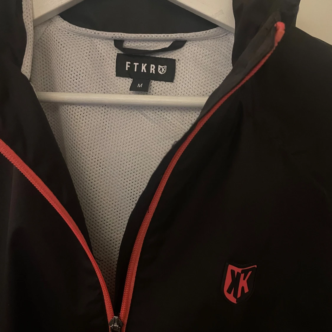 Snygg vindjacka från FTKR (footkorner) i svart och grått med röda detaljer. Jackan har huva, hel dragkedja framtill och två fickor med röda dragkedjor. Lätt meshfoder på insidan och cool logga på bröstet. Perfekt för blåsiga dagar och streetstyle.
