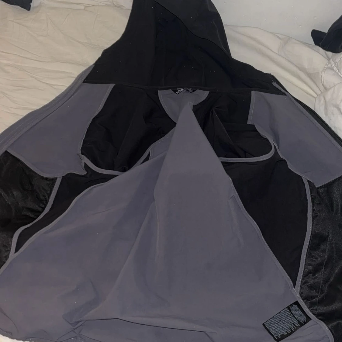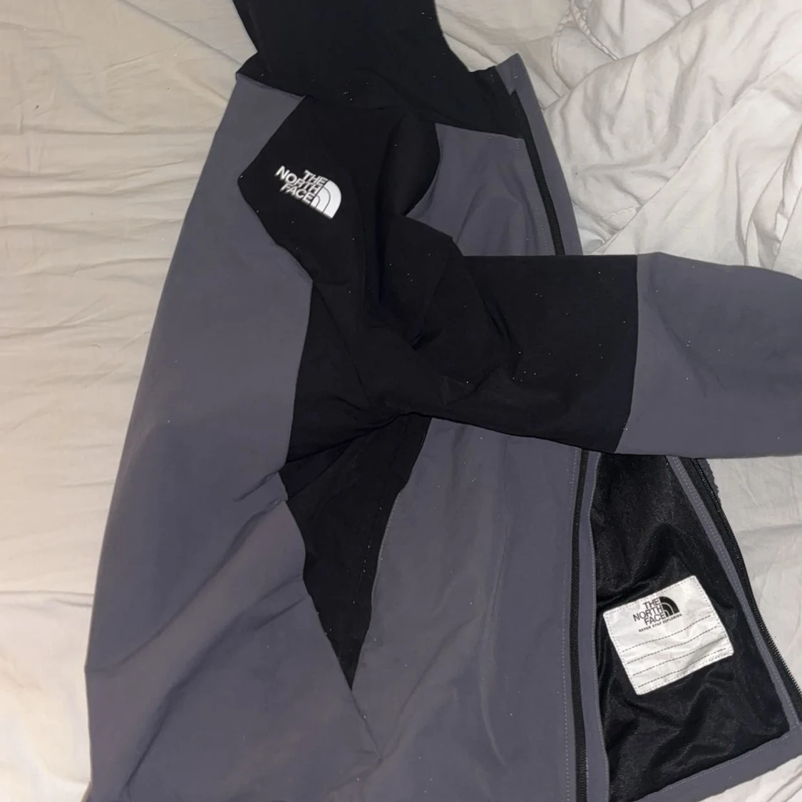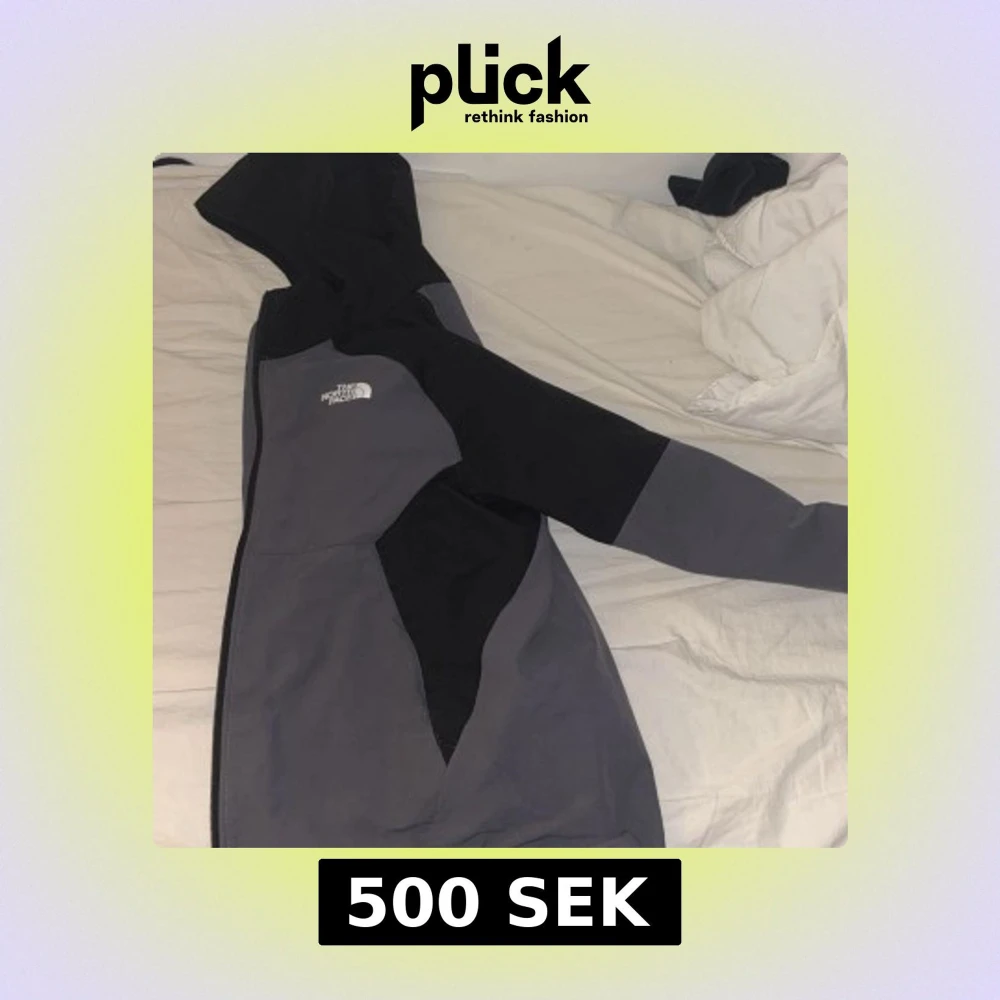 Säljer en snygg svart och grå vindjacka från The North Face med huva och dragkedja. Jackan har en sportig look och är perfekt för blåsiga dagar. Färgblockad design och logga på bröstet ger en clean vibe. Passar dig som gillar streetwear och outdoor.