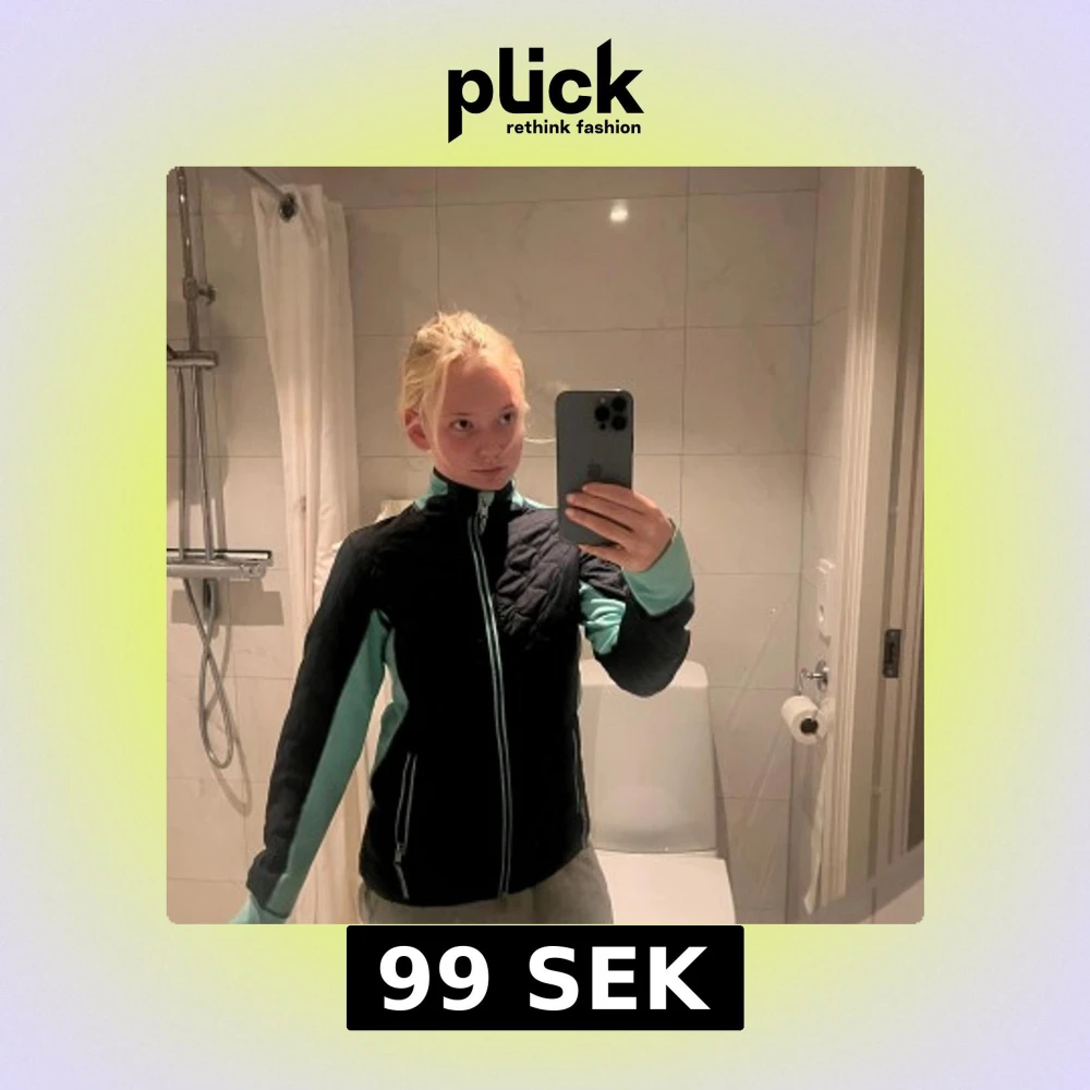 Säljer en sportig vindjacka i svart och mintgrönt med quiltade partier framtill och på ärmarna. Jackan har hel dragkedja och långärmad design, perfekt för utomhusaktiviteter. Snygga kontrasterande färger och praktiska fickor med dragkedja.