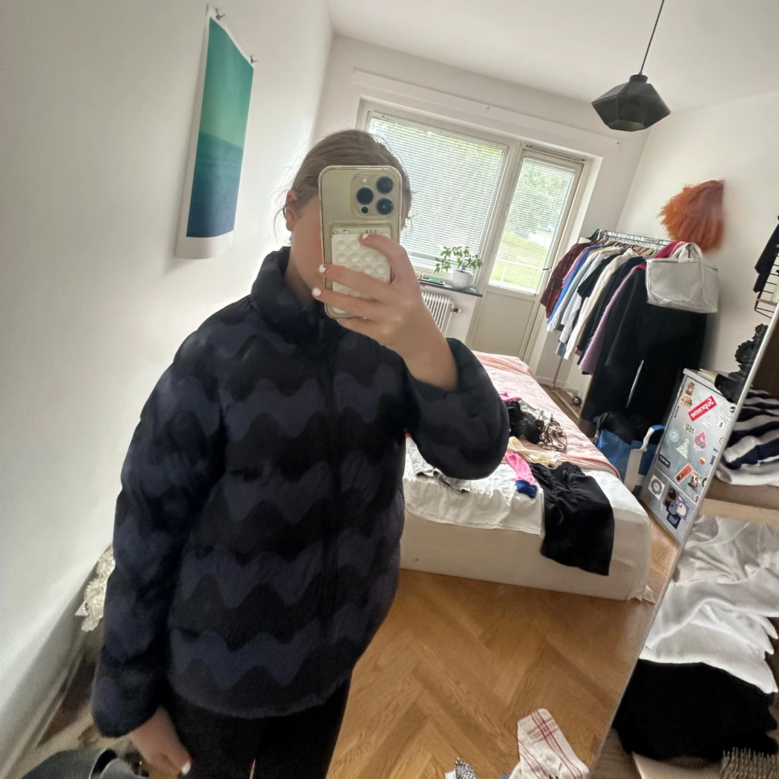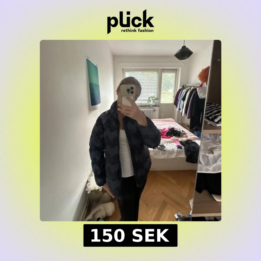 Säljer en riktigt snygg pufferjacka i svart och mörkblått med vågigt mönster. Jackan har hög krage, dragkedja framtill och en oversized passform som ger en cool vibe. Perfekt för kalla dagar när du vill sticka ut lite extra.