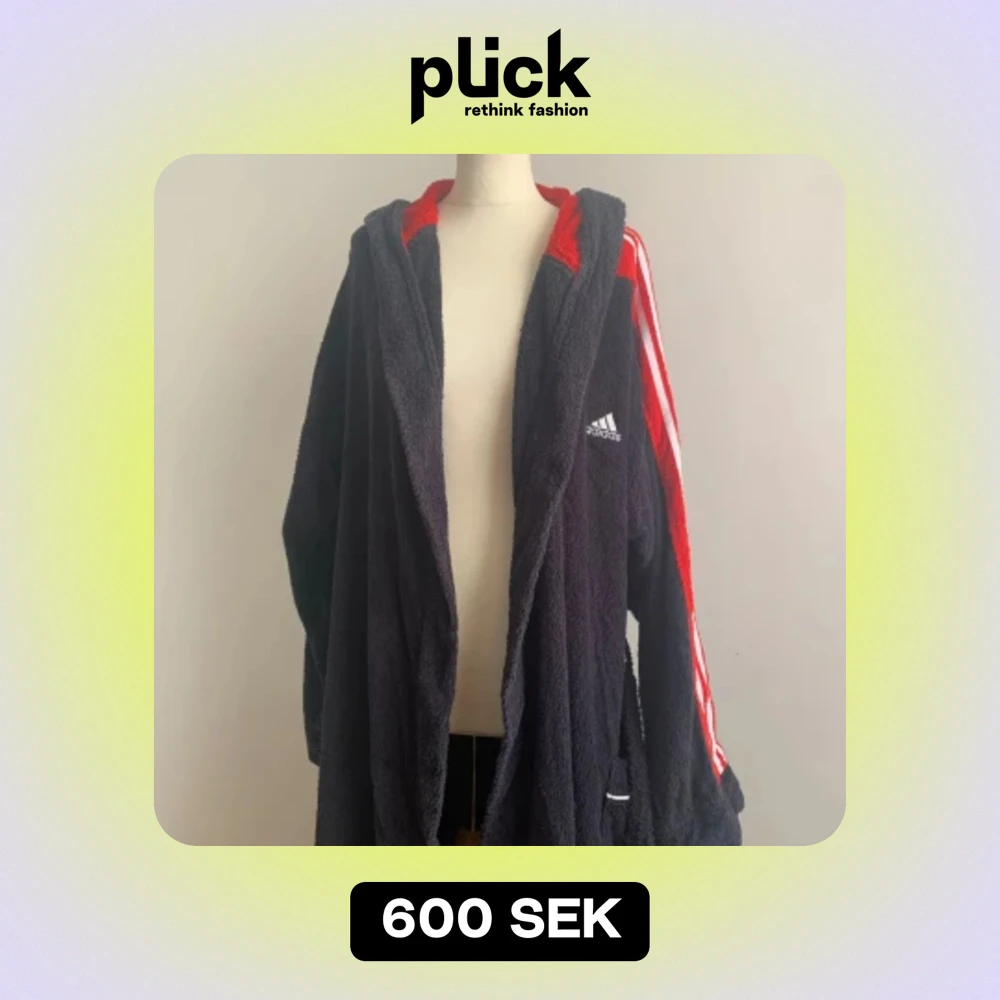 Säljer en supermysig svart och röd vintage Adidas morgonrock. Den har en huva och är gjord av mjukt fleece-material. Rocken har de klassiska Adidas-ränderna i vitt längs ärmarna och en stor Adidas-logga på ryggen. Perfekt för att hålla sig varm och bekväm hemma! pris kan diskuteras