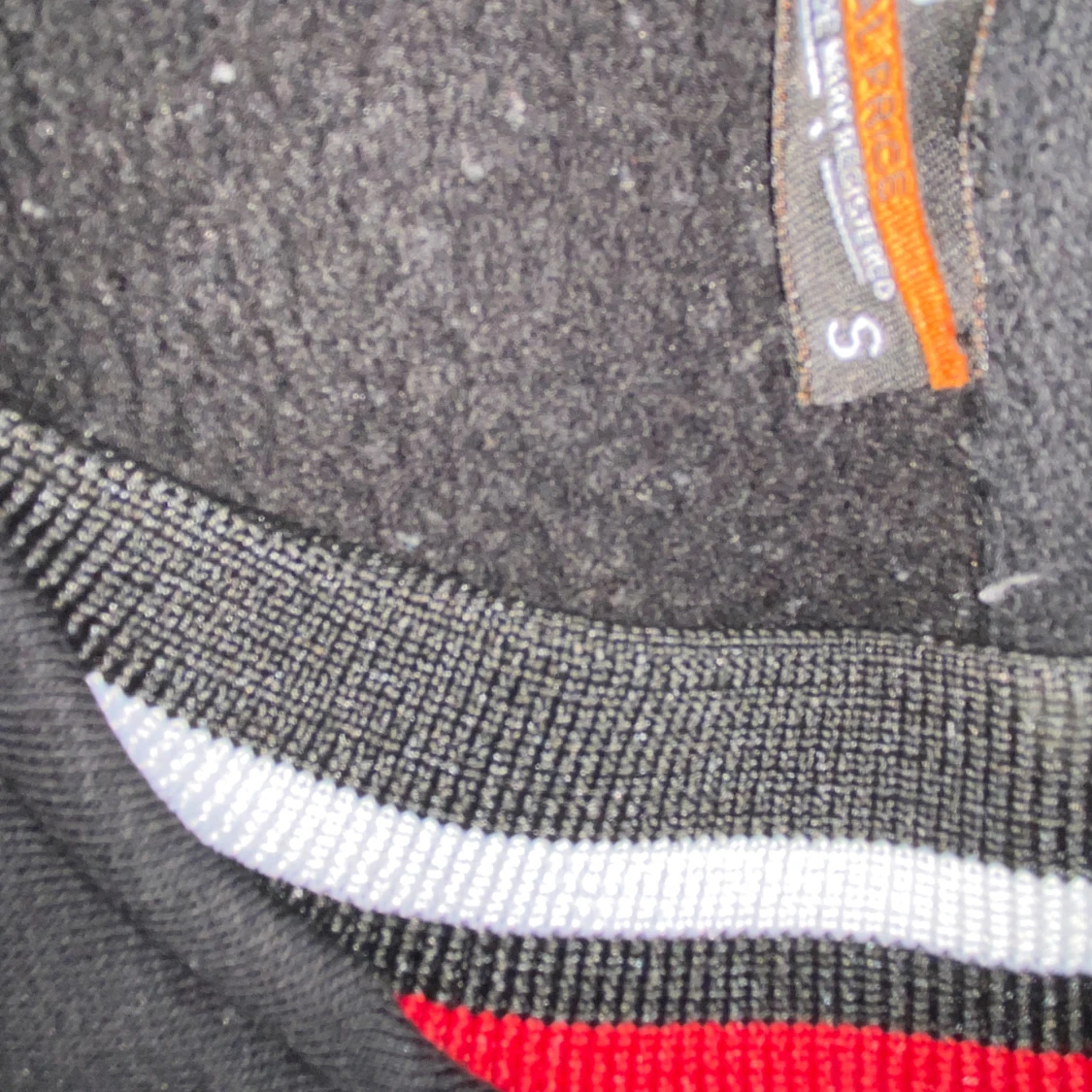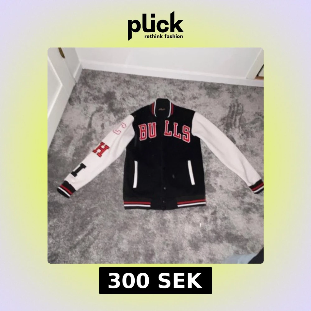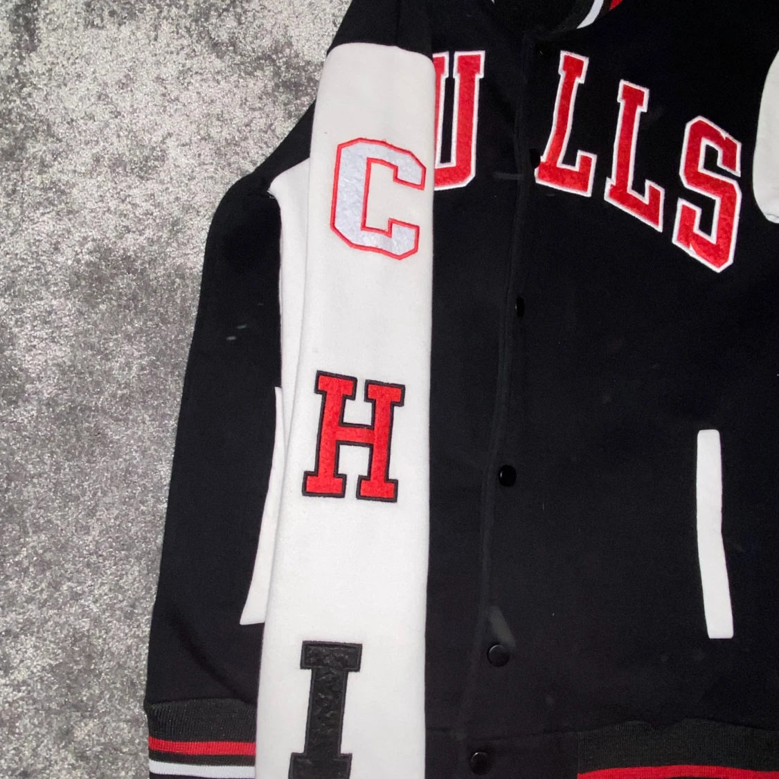 Snygg svart och vit bomberjacka från Sizelog i storlek S med stora röda BULLS-bokstäver på bröstet och broderade bokstäver på ena ärmen. Jackan har ribbade muddar med röd, vit och svart rand, knappar framtill och två fickor. Perfekt för dig som gillar sportig college-stil.