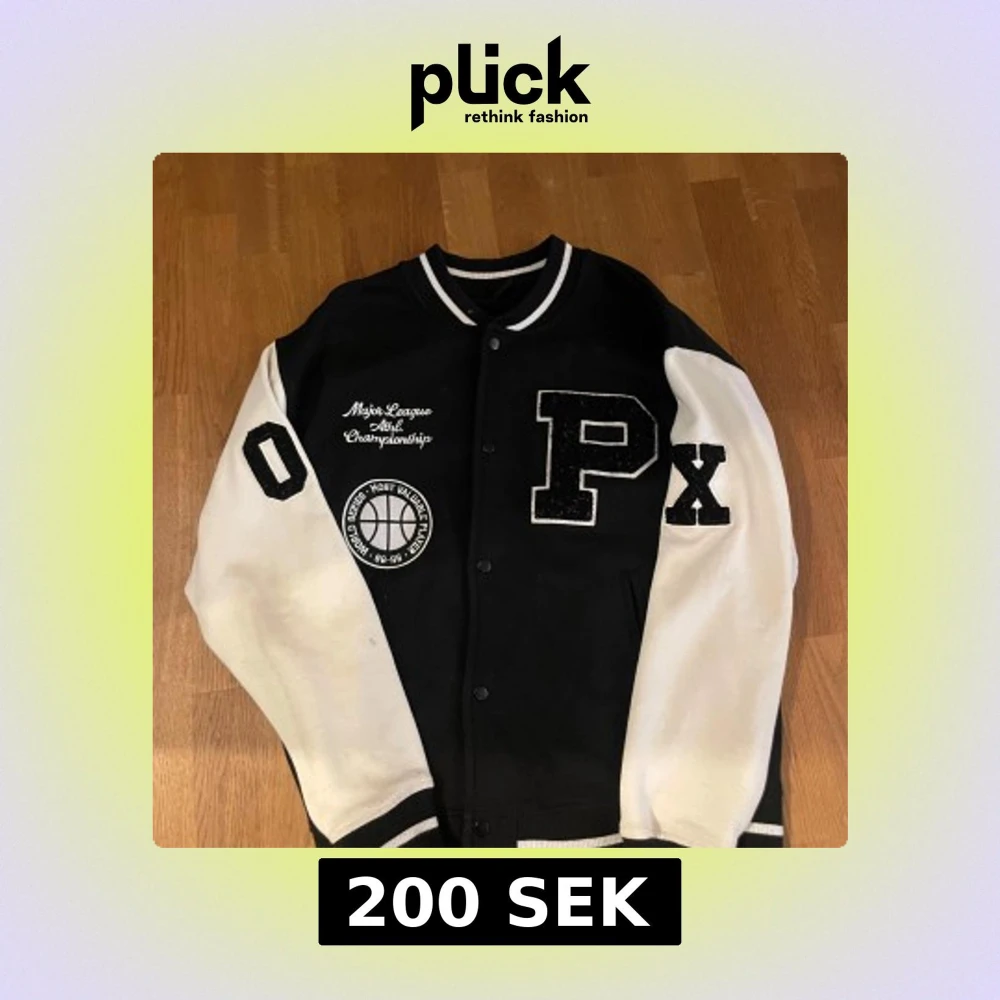 Snygg svart och vit bomberjacka med stora bokstäver och broderade detaljer. Jackan har vita ärmar, svart kropp och coola patches med sporttema. Stängs med knappar framtill och har ribbade muddar vid ärmslut och krage.