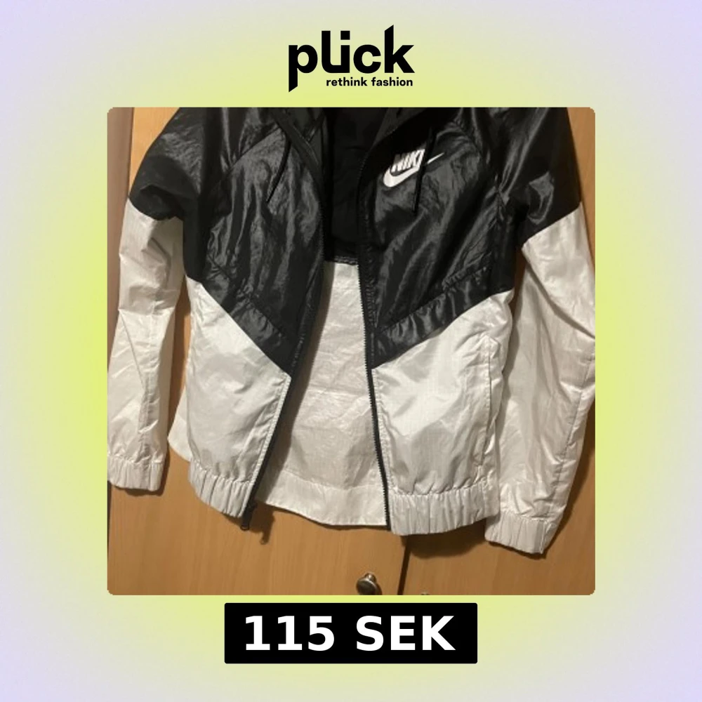Snygg svart och vit vindjacka från Nike med dragkedja och huva. Jackan har en sportig look med långärmade ärmar och elastiska muddar. Perfekt för blåsiga dagar.