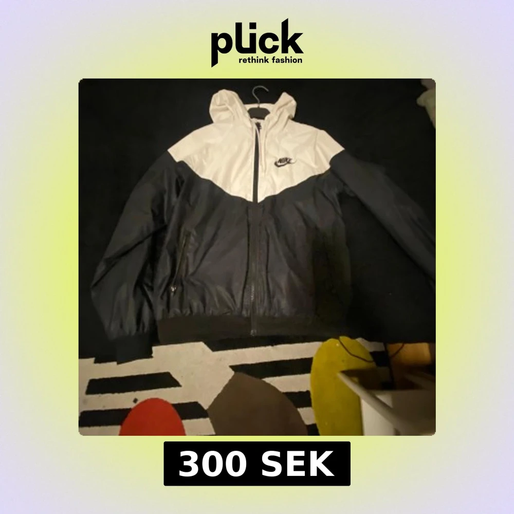 Säljer en snygg svart och vit vindjacka från Nike. Jackan har en dragkedja framtill och en praktisk huva. Perfekt för blåsiga dagar och har en sportig look. Den är tillverkad i ett lätt syntetmaterial.