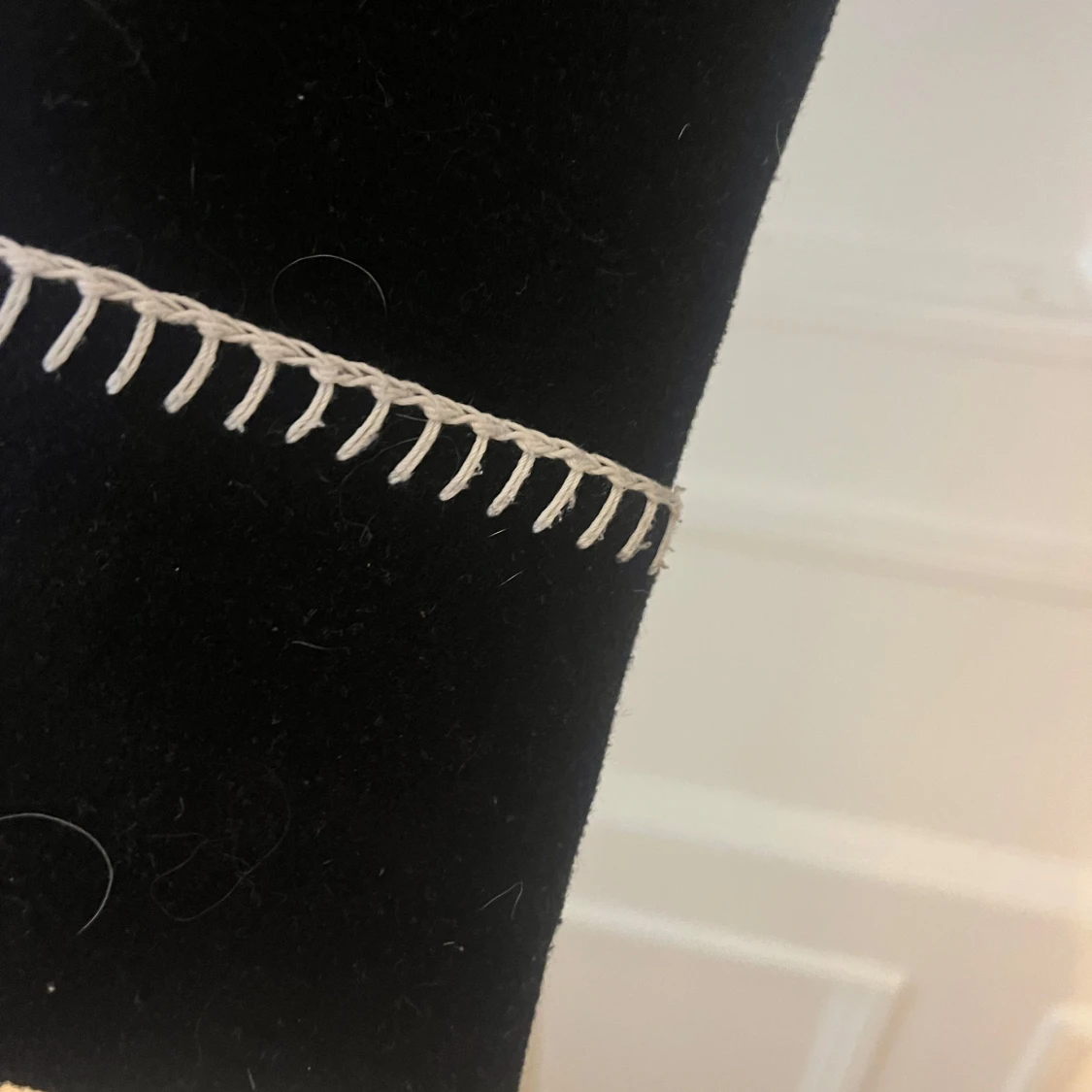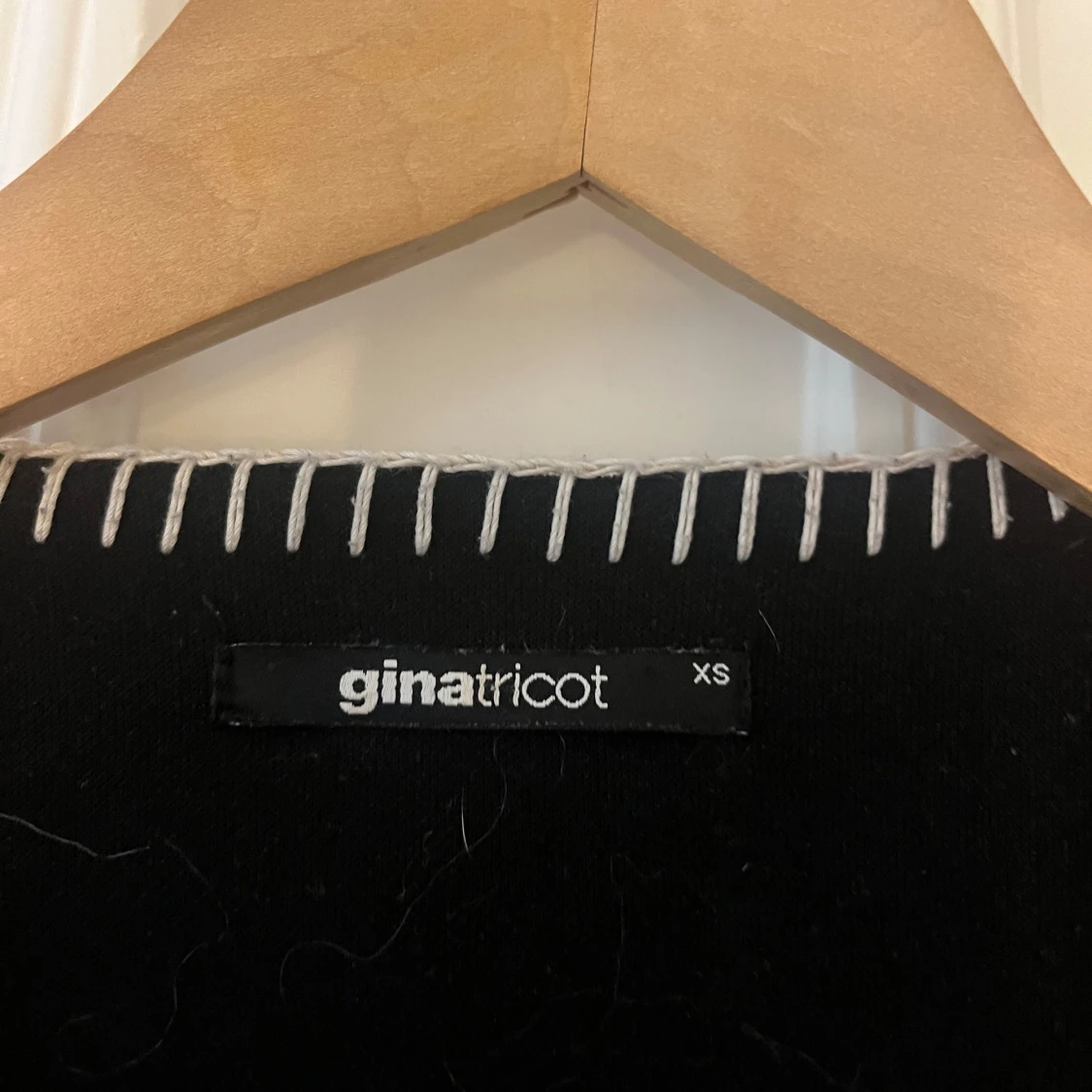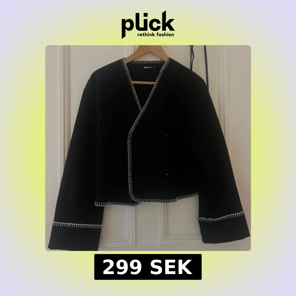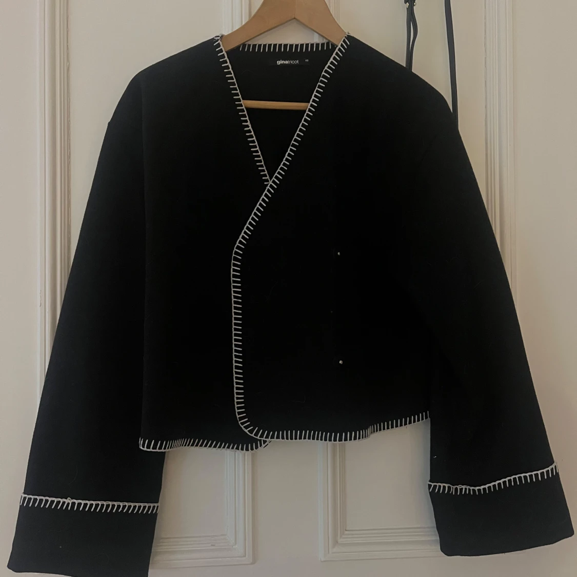 Säljer en stilren svart omlottjacka från Gina Tricot i storlek XS. Jackan har vita kontrastsömmar längs kanterna och ärmarna, vilket ger en snygg detalj.