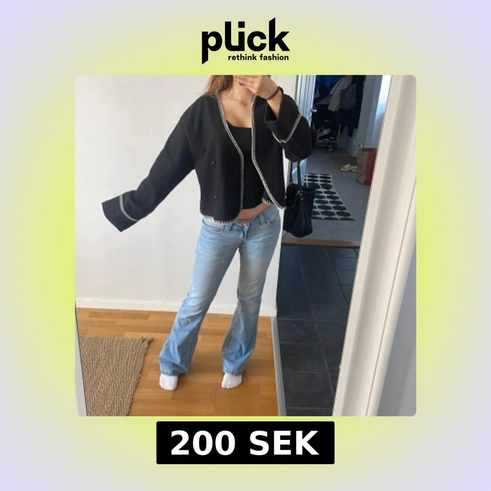 Snygg svart omlottjacka med vita sömmar. Jackan har långa ärmar och en croppad passform.