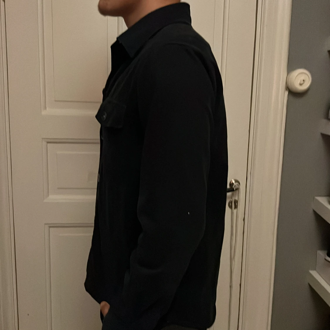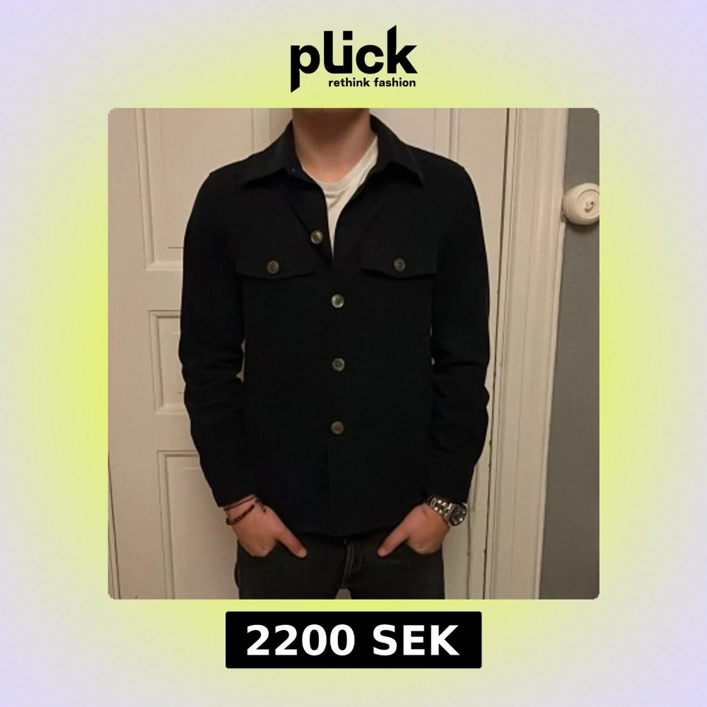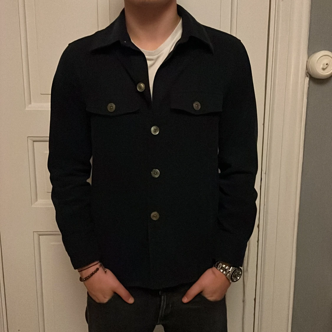 Stilren marinblå overshirt från Oscar Jacobson med klassisk krage, raka linjer och fyra knappar framtill. Två bröstfickor med lock och knappar ger en snygg touch. Perfekt att bära över en t-shirt för en clean look. Nypris 3000kr