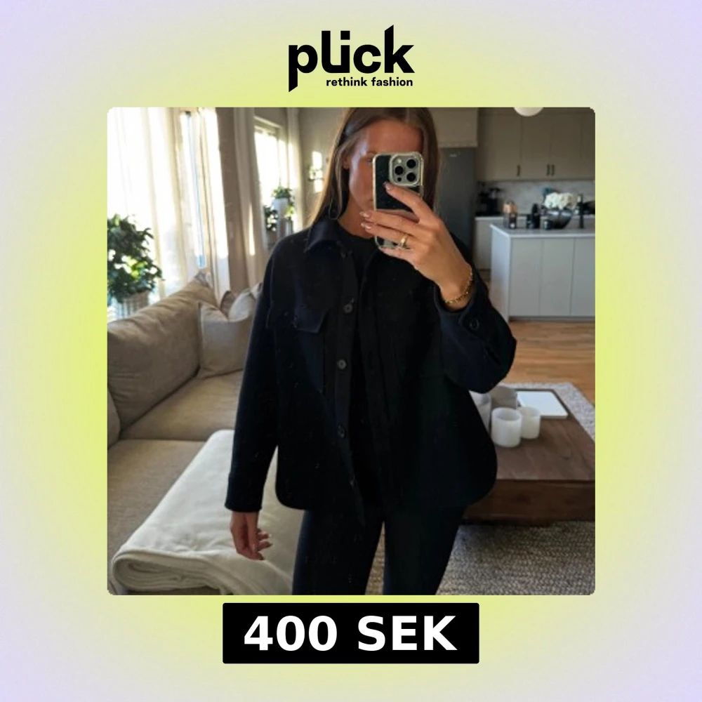 Svart overshirt från Zara med klassisk krage och två stora bröstfickor med knappar. Jackan har en loose passform och är tillverkad i ett tjockare ullmaterial som ger en cool och avslappnad vibe.