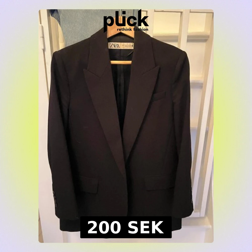 Säljer en svart oversized kavaj från Zara. Klassisk modell med breda slag, två fickor framtill och knappar vid ärmsluten. Perfekt för en clean och stilren look. Materialet känns mjukt och följsamt, vilket gör den bekväm att bära hela dagen.
