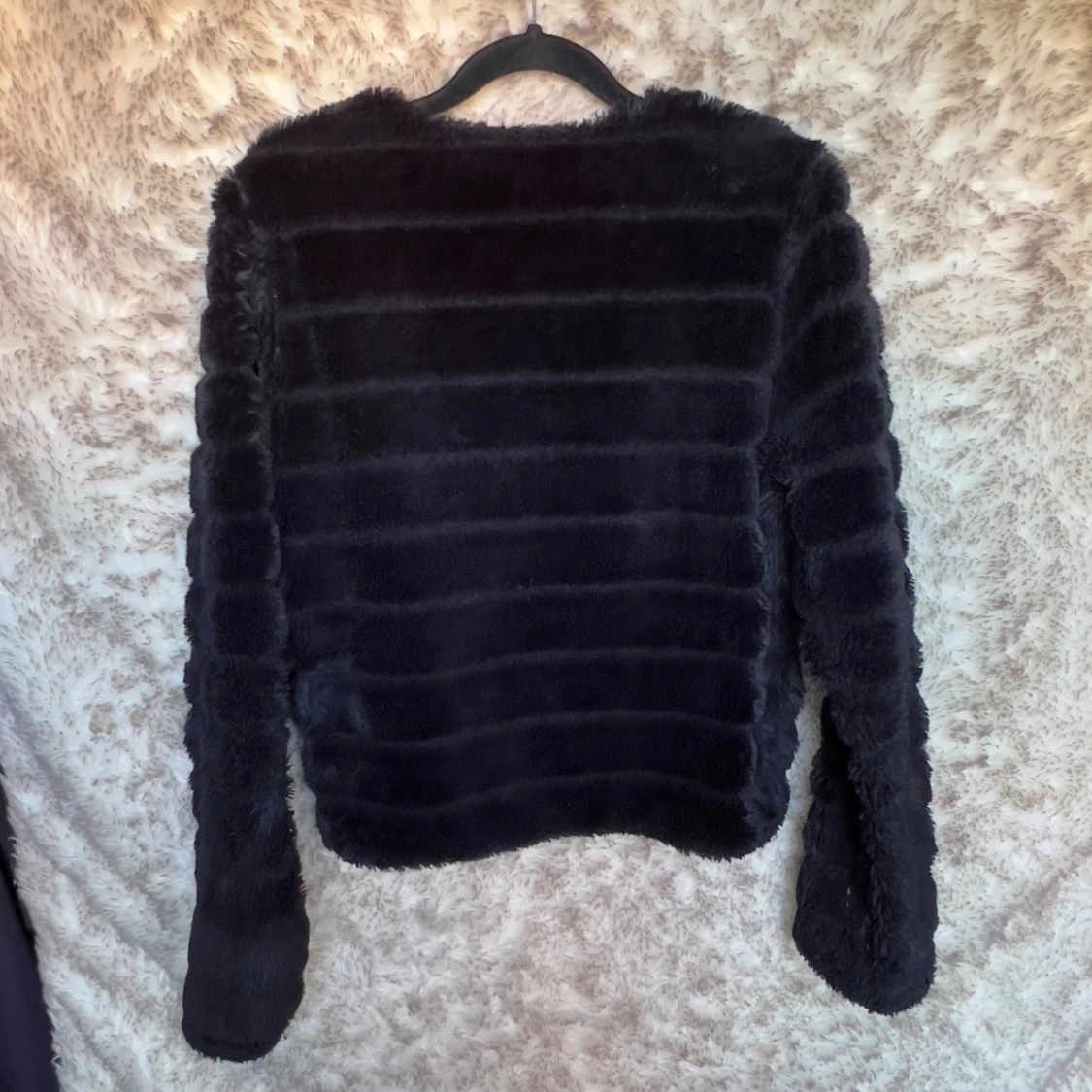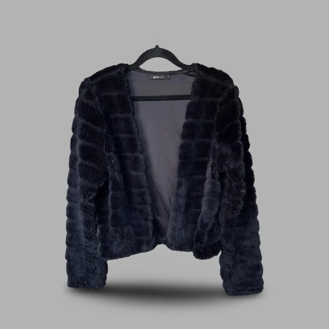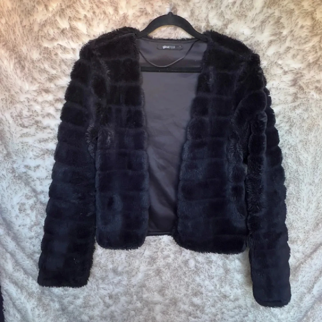 Mysig svart pälsjacka med tunt silkigt foder. Jackan är kortare i modellen. Ingen knäppning/dragkedja.