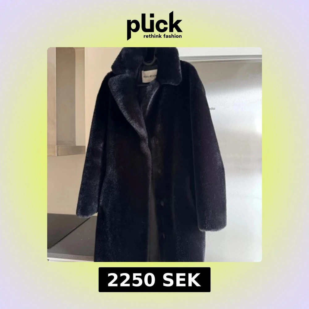 Säljer en svart pälsjacka från Stand Studio med klassisk krage och knappar framtill. Jackan har en rak och oversized passform med långa ärmar och mjukt, fluffigt material som ger en lyxig vibe. Perfekt för dig som vill ha en statement piece i garderoben.