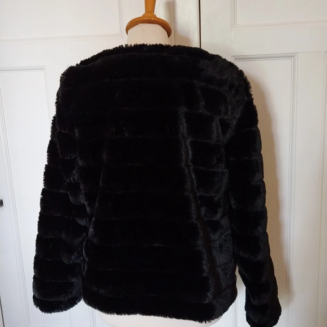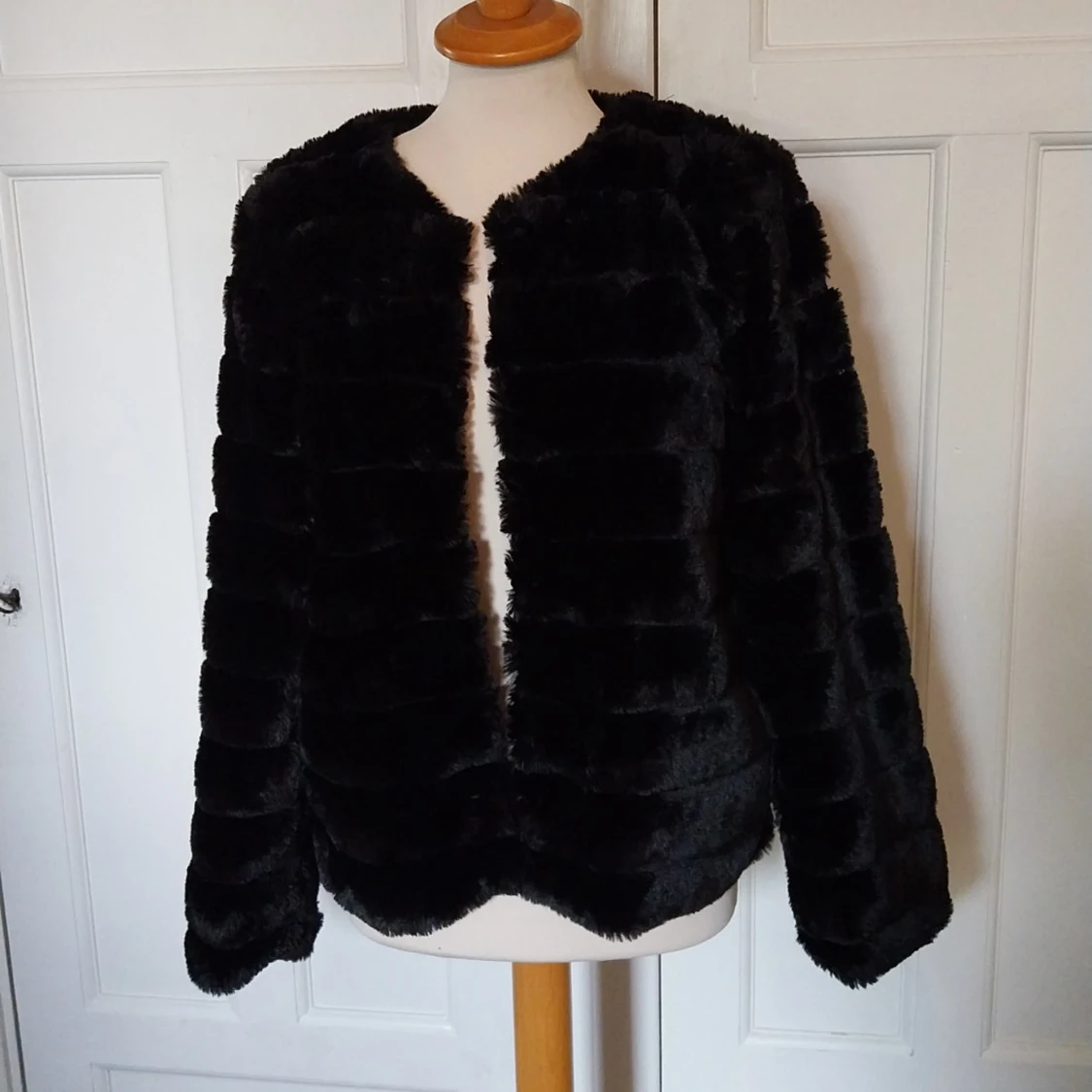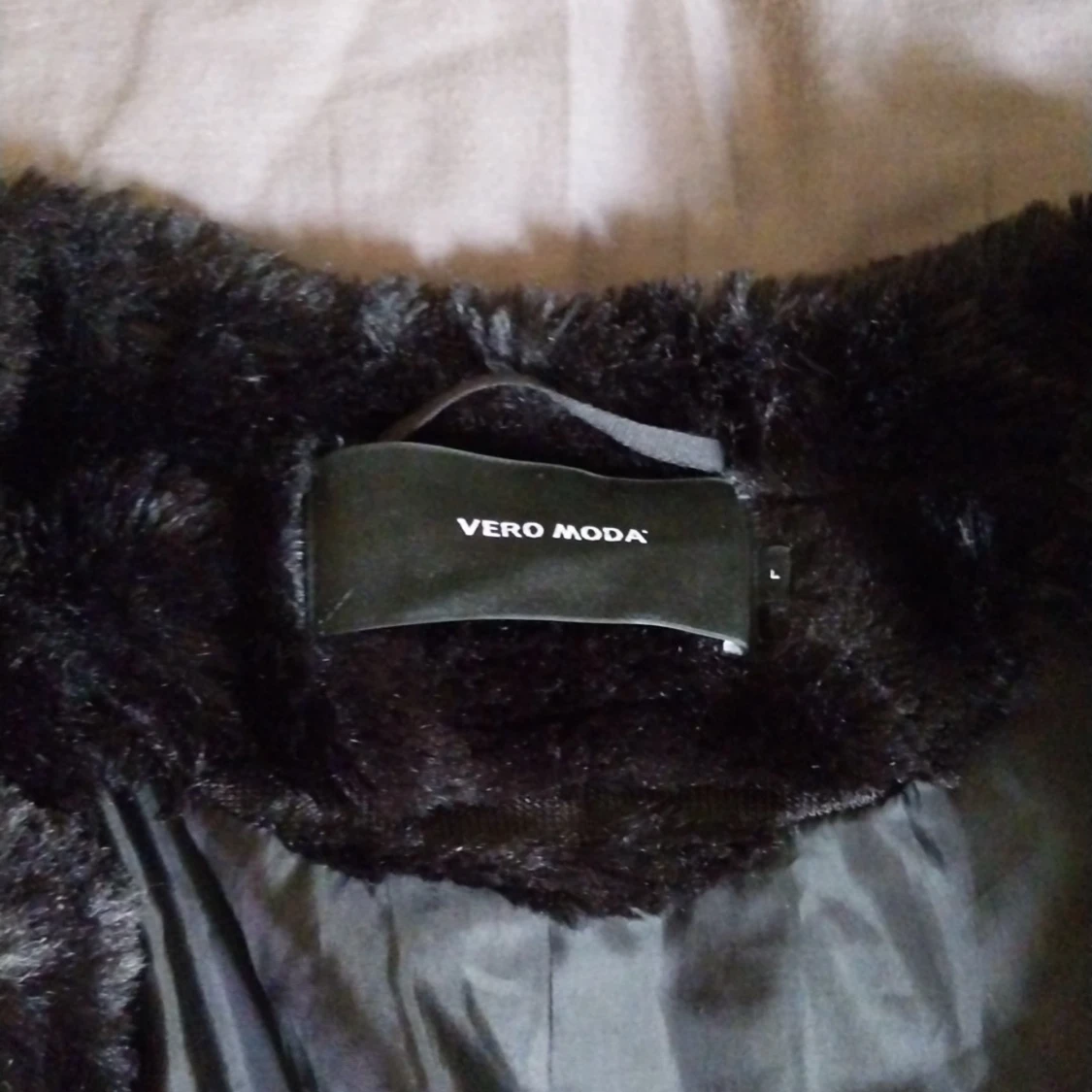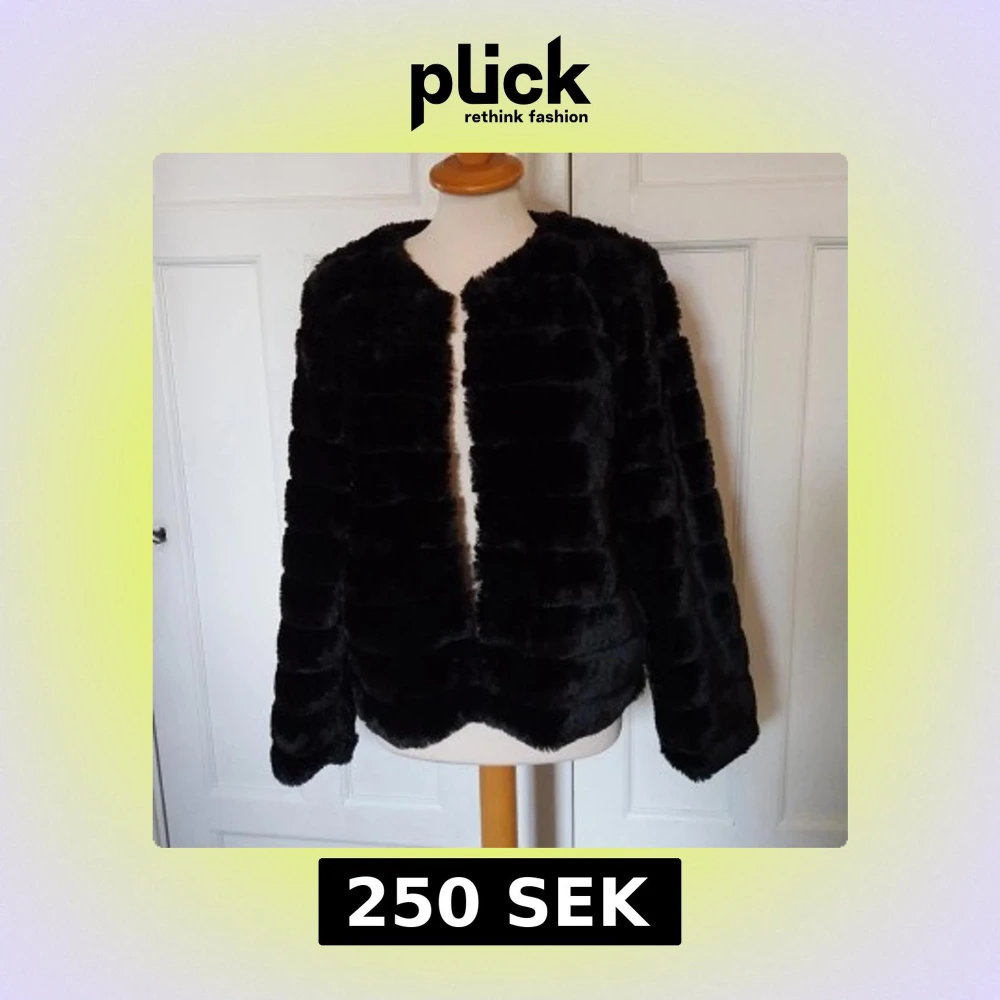 Säljer en svart pälsjacka från Vero Moda i storlek L. Jackan är gjord i mjuk fuskpäls med horisontella paneler och har en klassisk, rundad halsringning. Perfekt för dig som vill ha en snygg och trendig look under kyliga dagar.
