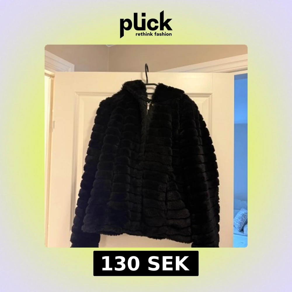 Säljer en snygg svart pälsjacka med dragkedja och luva. Hål i ena fickan men går att sy ihop snabbt. Passar både S och M