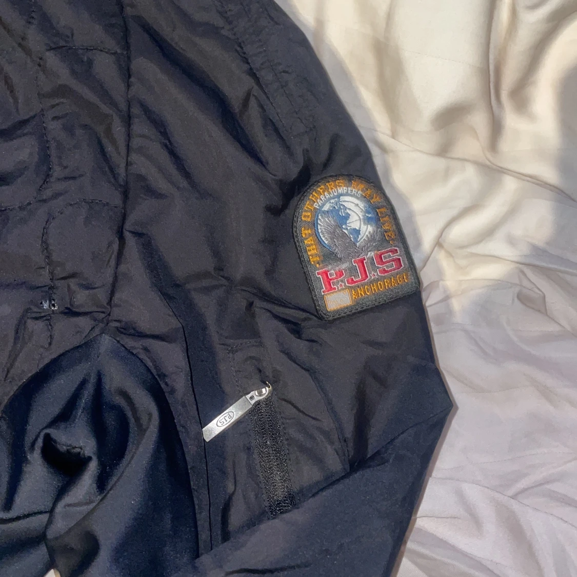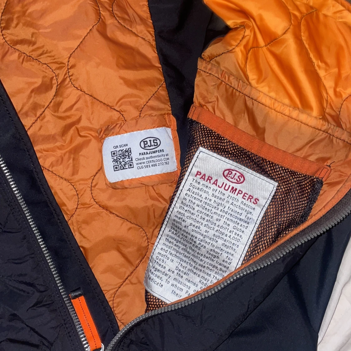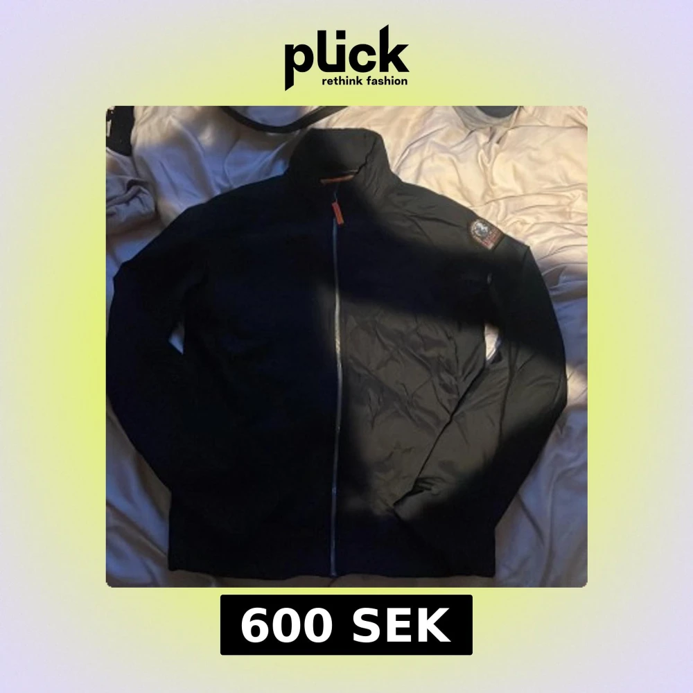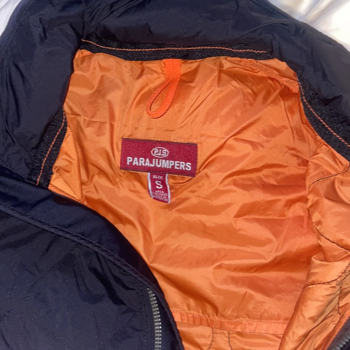 Säljer en svart Parajumpers jacka i storlek S med orange quiltat foder och klassisk PJS-patch på ärmen. Jackan har hel dragkedja framtill, hög krage och diskreta fickor med dragkedja. Perfekt för dig som vill ha en stilren och sportig look.