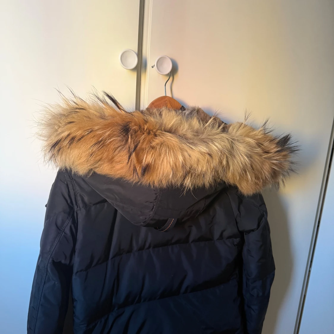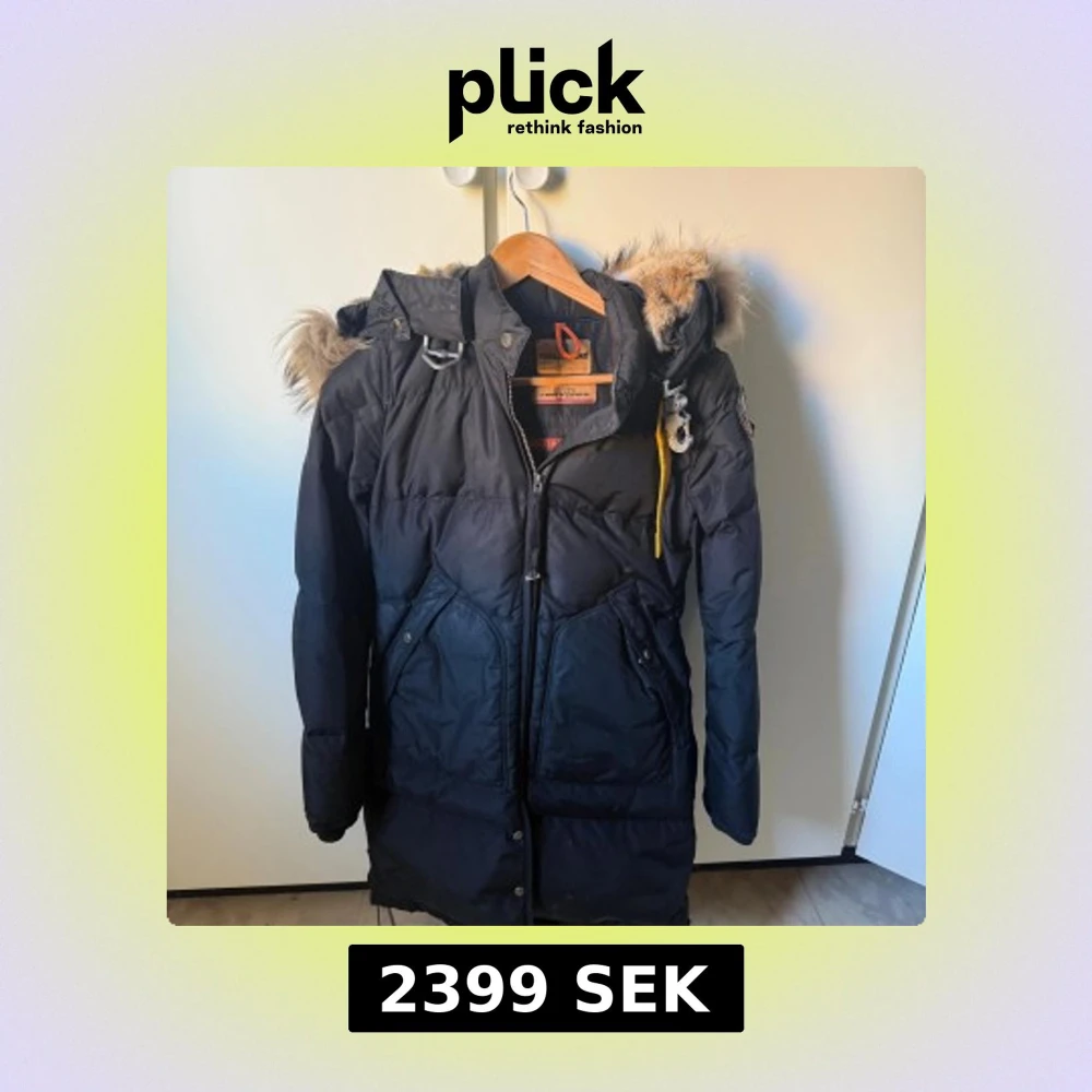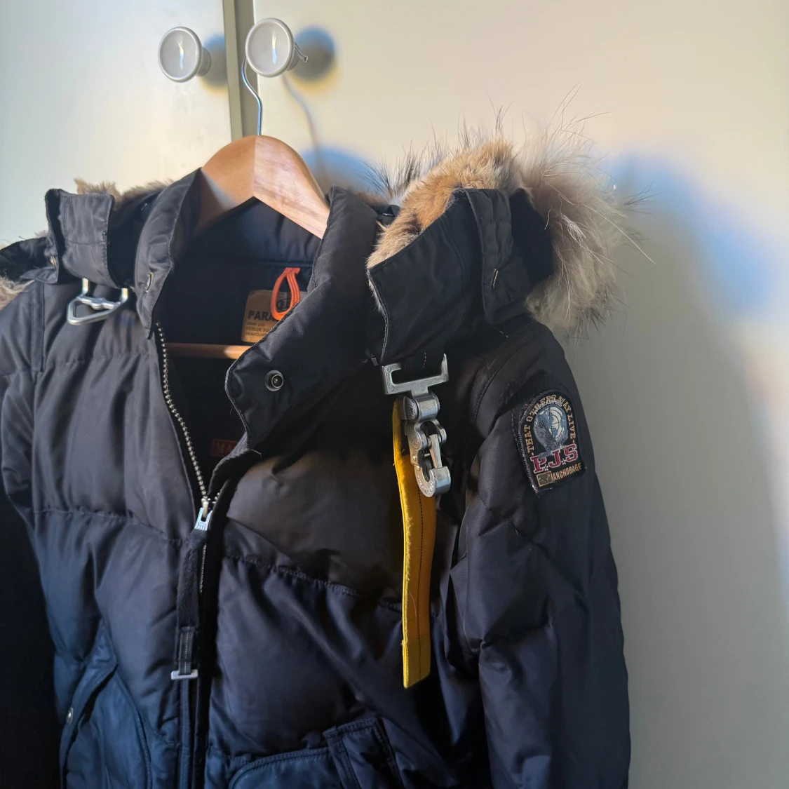 Säljer en svart lång dunjacka från Parajumpers med ikonisk gul rem och patch på ärmen. Jackan har huva med fluffig päls, dragkedja och stora fickor framtill. Perfekt för kalla dagar och riktigt snygg streetstil. Storlek XS men passar S också