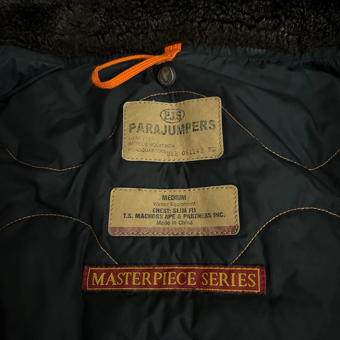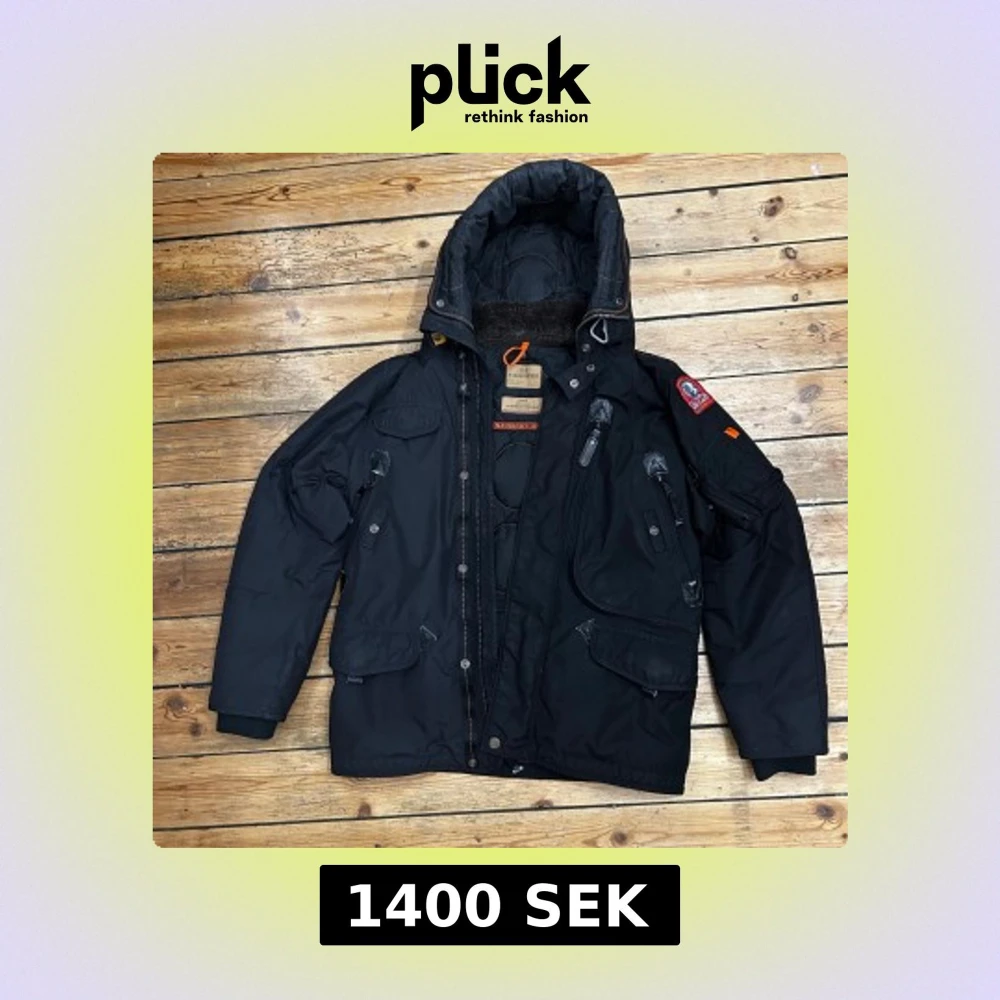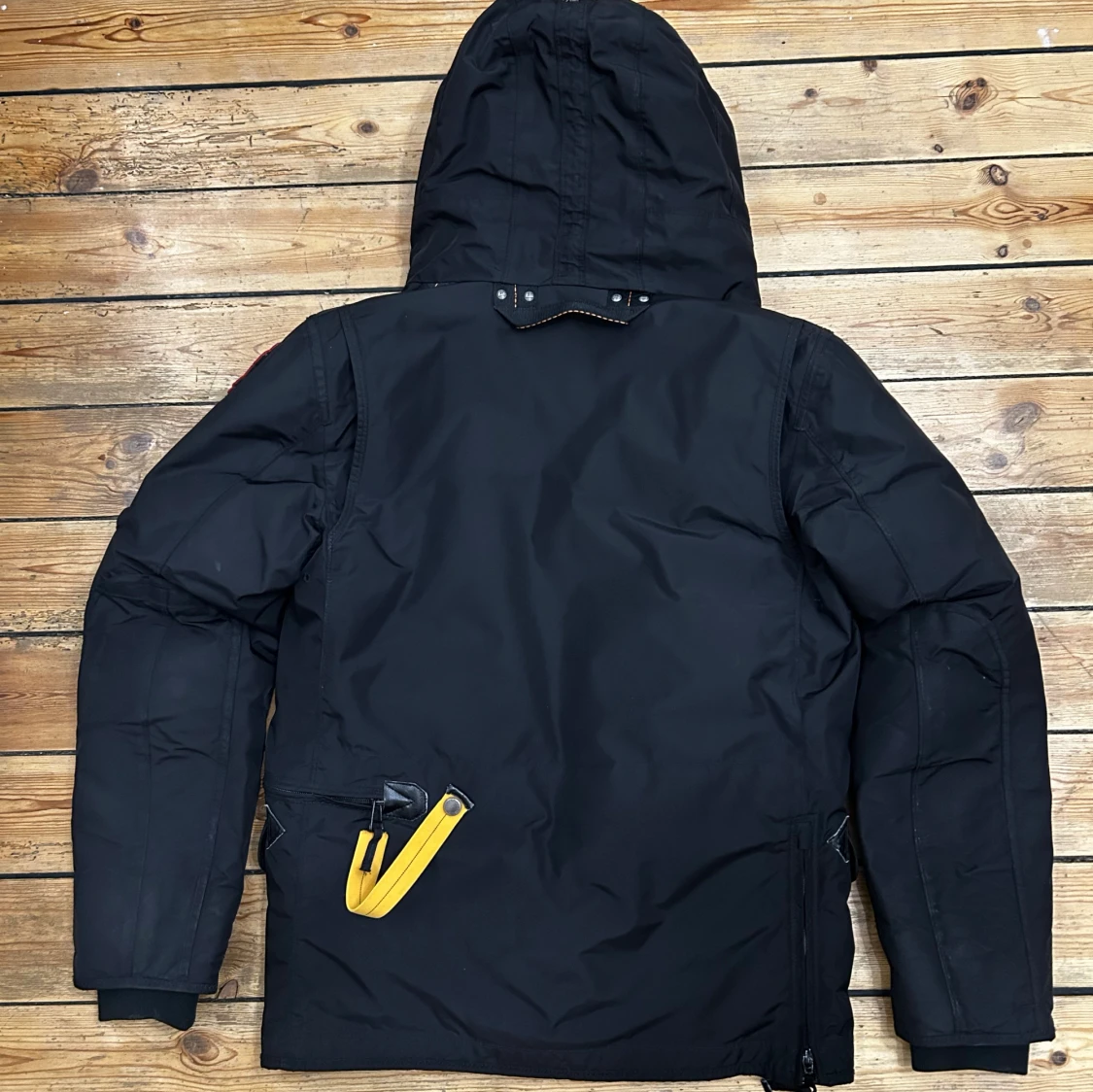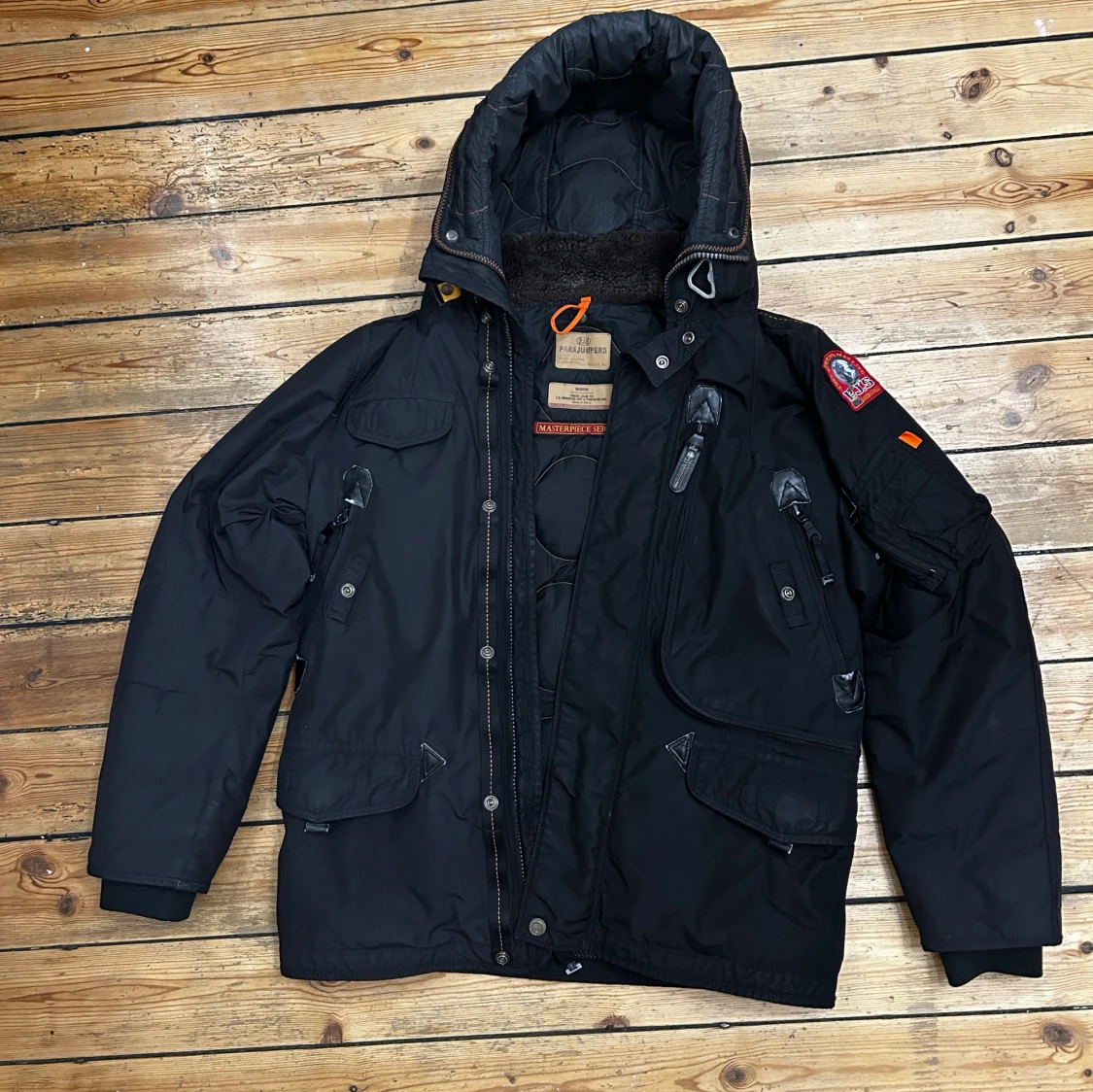 Grym svart vinterjacka, en äkta Parajumpers Right Hand Masterpiece med huva, flera fickor och coola detaljer som patch på ärmen och gul rem bak. Jackan är vadderad och har dragkedja och knappar framtill. Perfekt för kalla dagar och riktigt snygg streetstil.