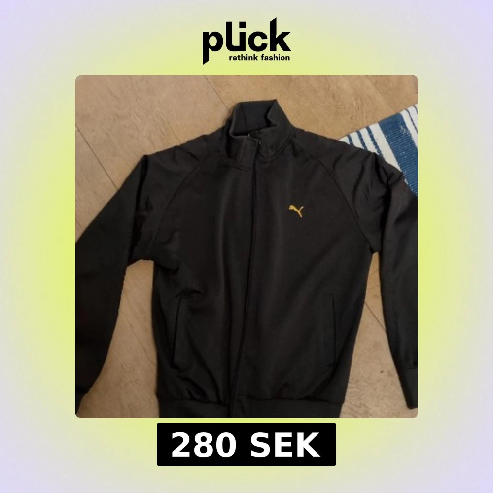 Snygg svart jacka från Puma med dragkedja och gul logga på bröstet. Perfekt för en sportig look. Jackan har långa ärmar och en hög krage för extra stil och komfort. (dragkedjan defekt men lättlagad)