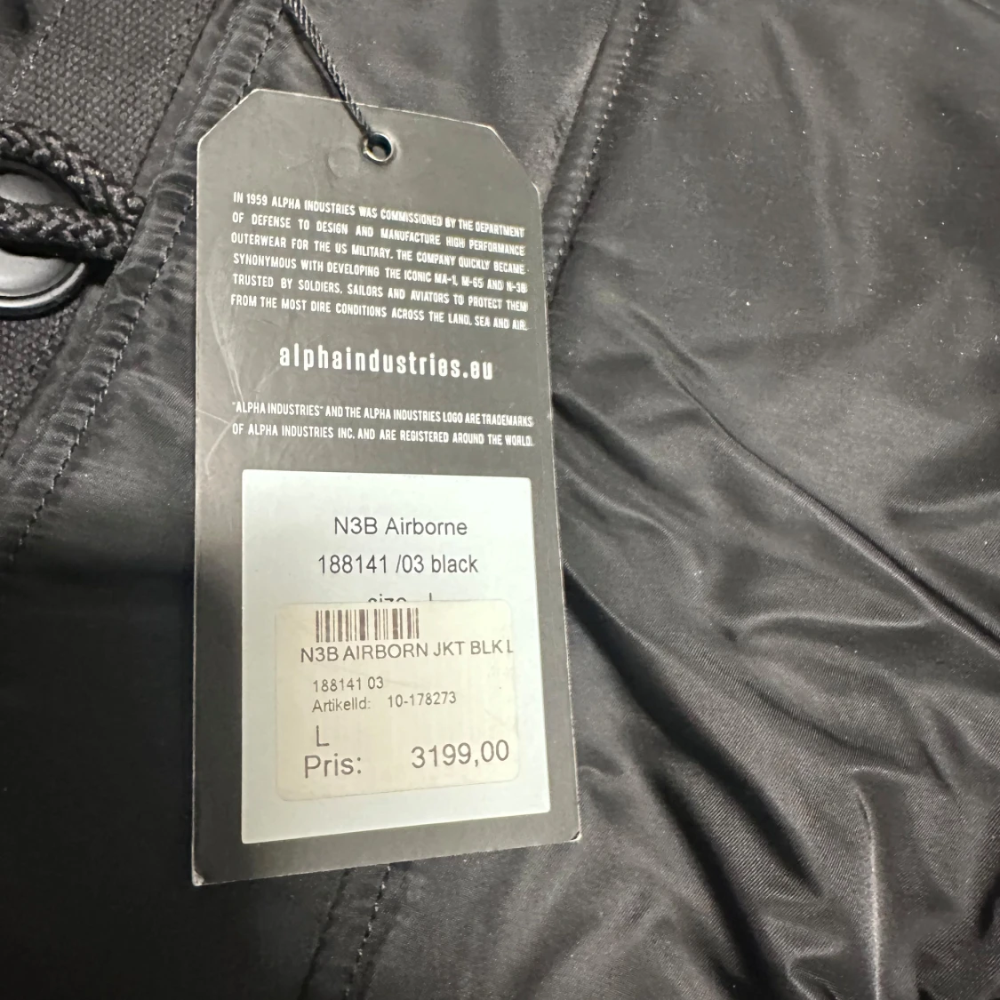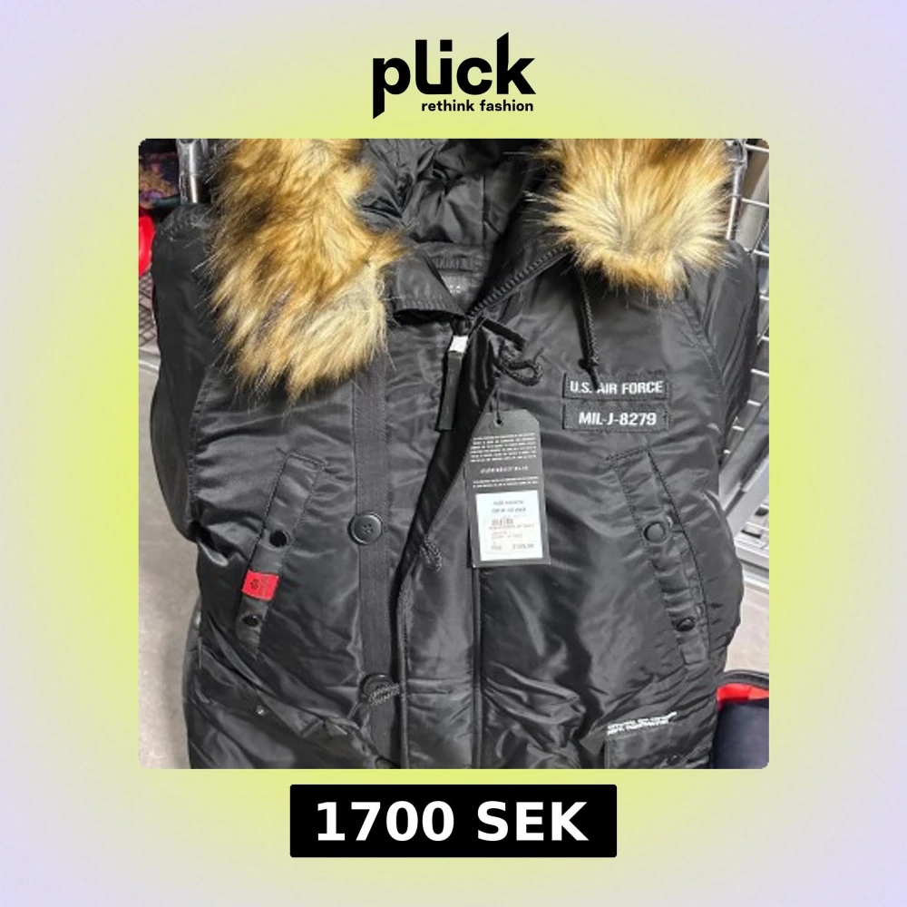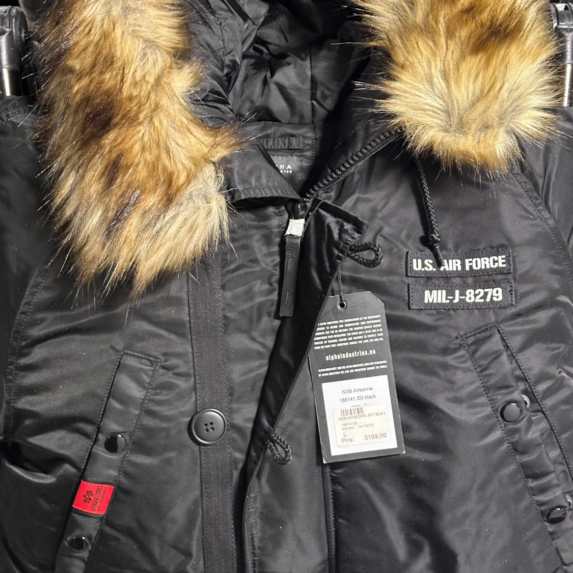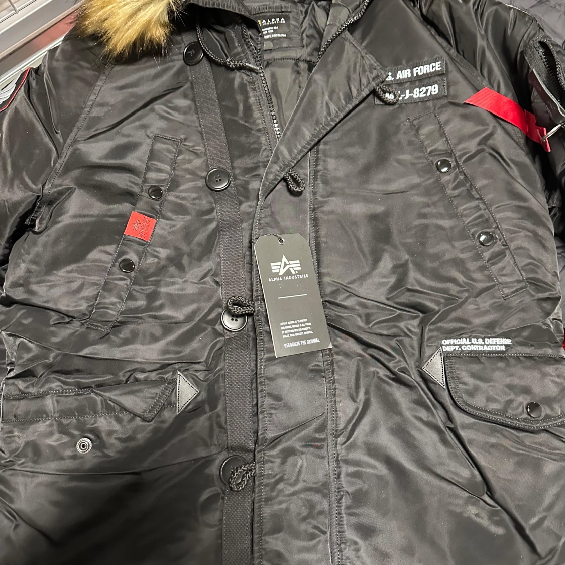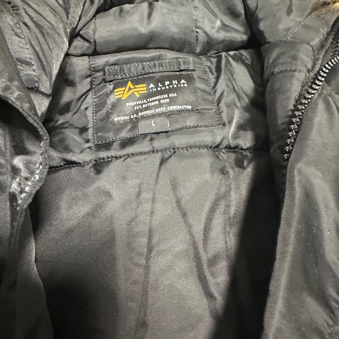 Säljer en svart parkajacka från Alpha Industries med pälsfodrad huva och dragkedja. Jackan har flera fickor och detaljer som knappar och broderad text. Perfekt för kalla dagar med sin robusta design och varma foder.