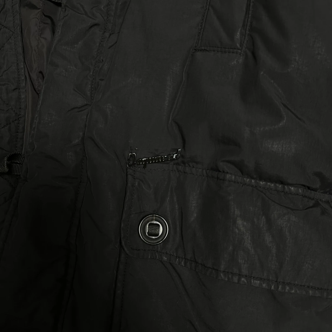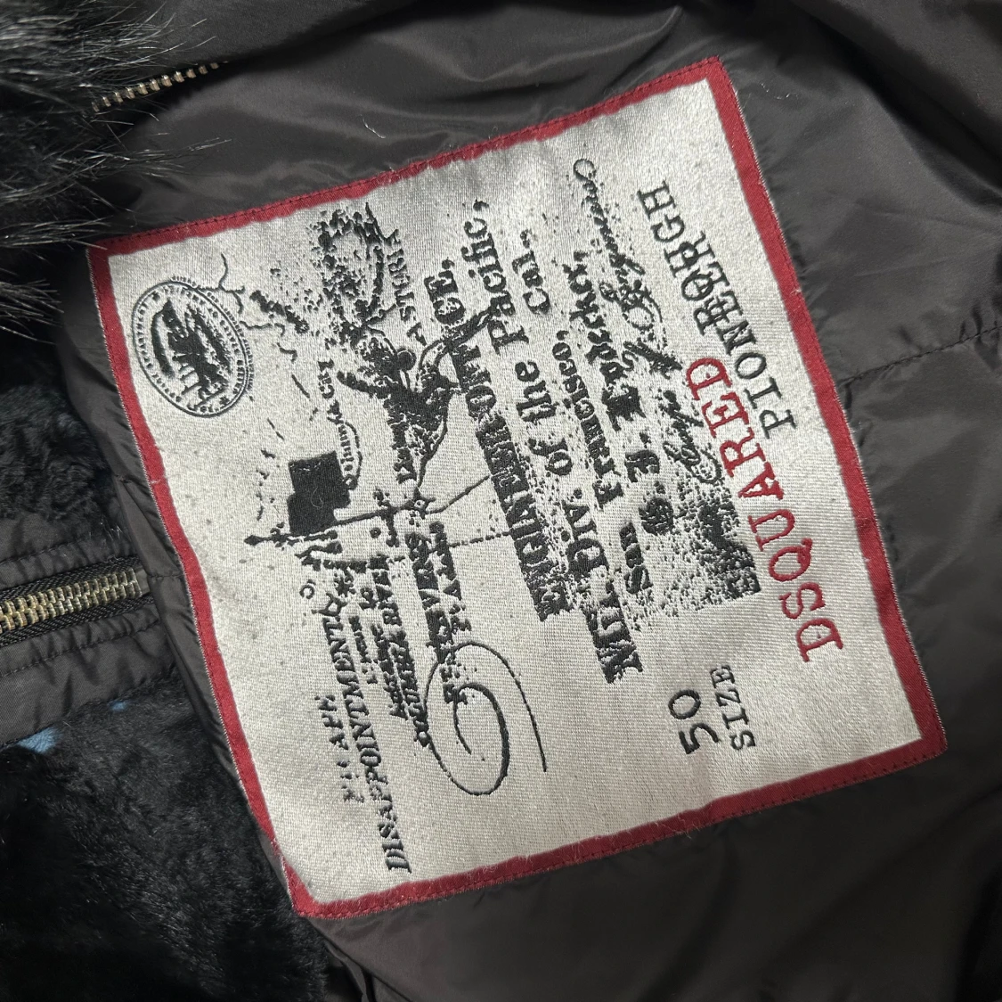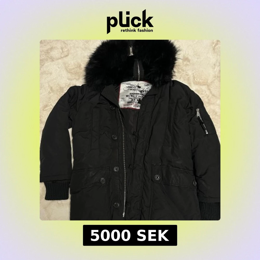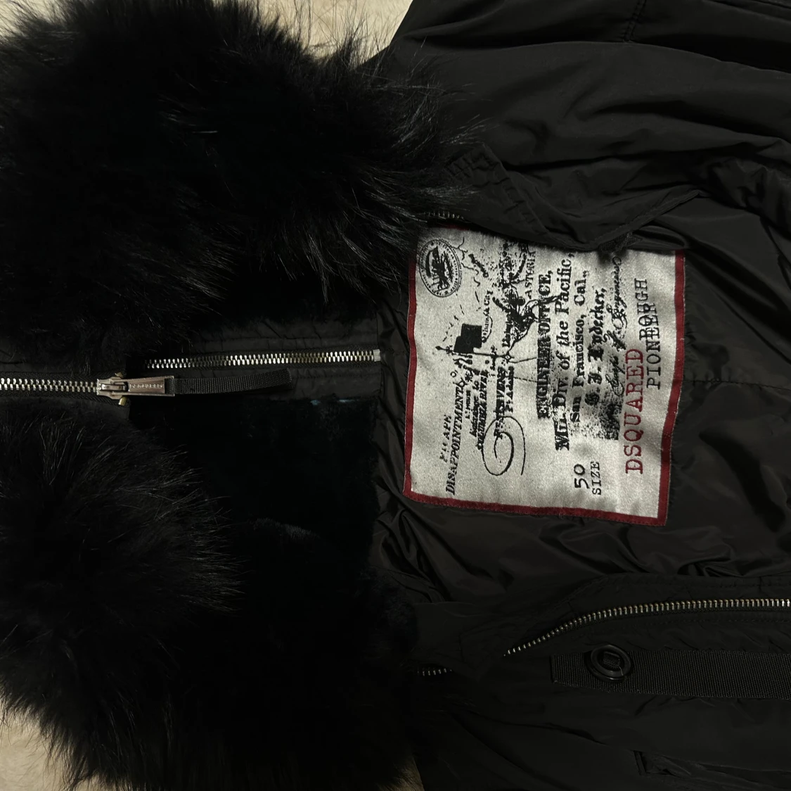 Väldigt u ik modell, köpte för 22 tusen Säljer en svart parkajacka från Dsquared2 med stor fluffig fuskpäls på huvan. Jackan har dragkedja och knappar framtill, flera fickor och ribbade muddar vid ärmsluten. Perfekt för kalla dagar och riktigt snygg streetstil.