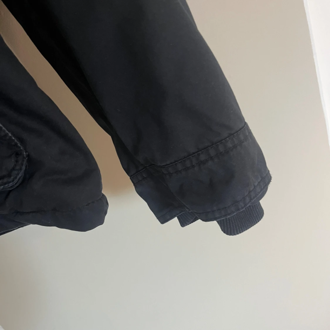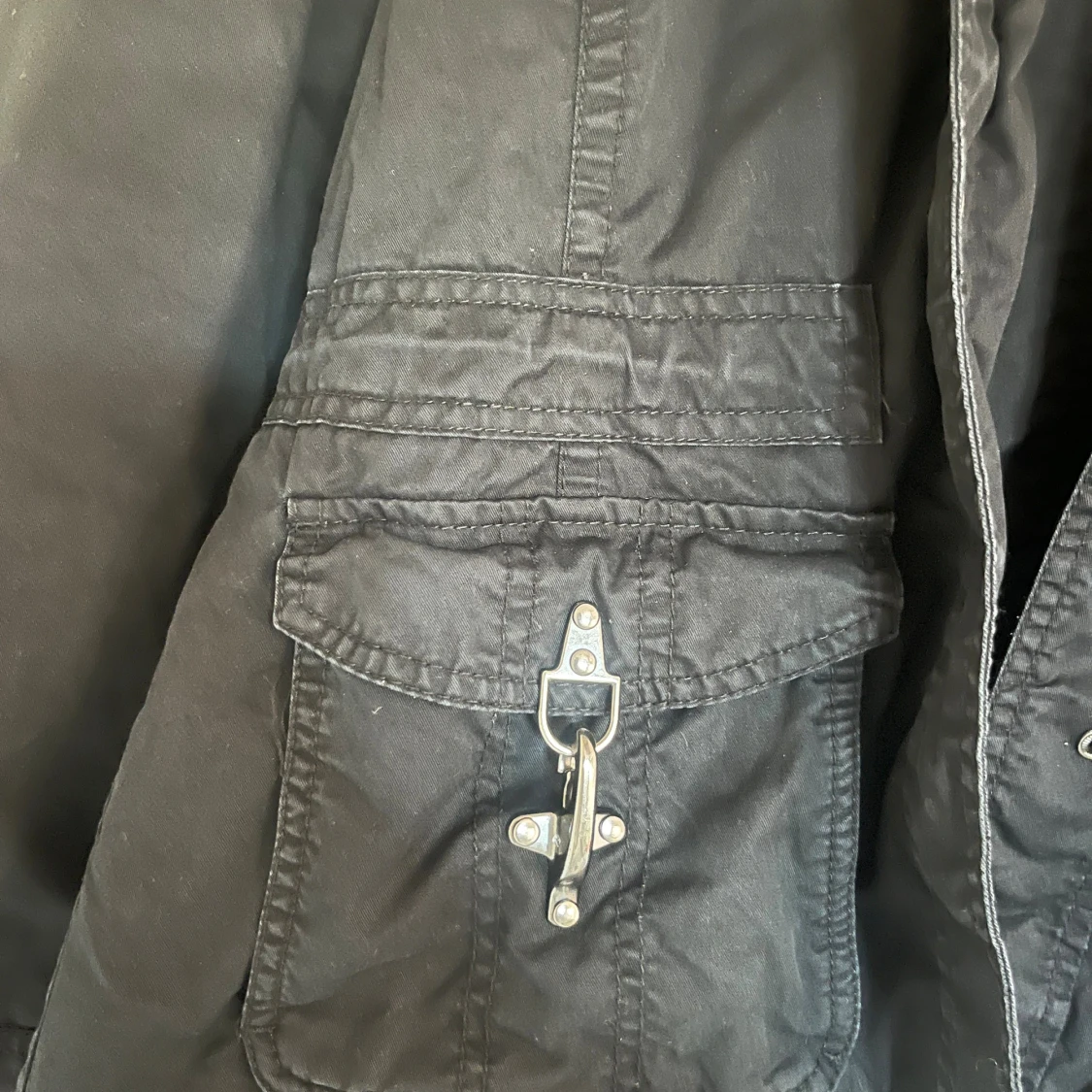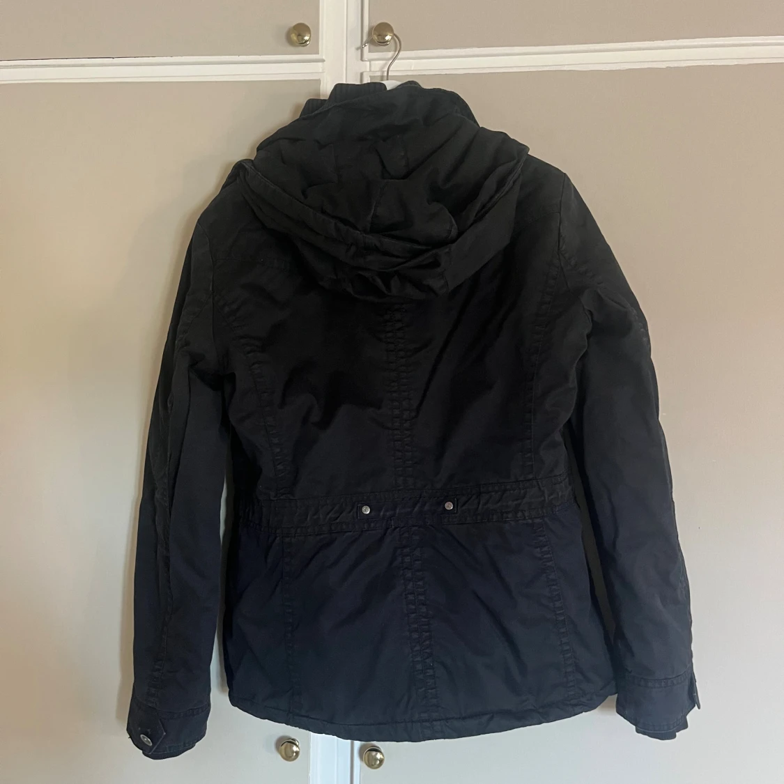 Svart parkajacka med hög ribbad krage, dragkedja framtill och stora fickor med metallspännen. Jackan har långa ärmar med ribbade muddar och flera snygga detaljer som tryckknappar och justerbar midja. Perfekt för kyligare dagar.