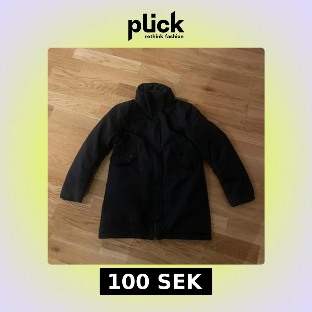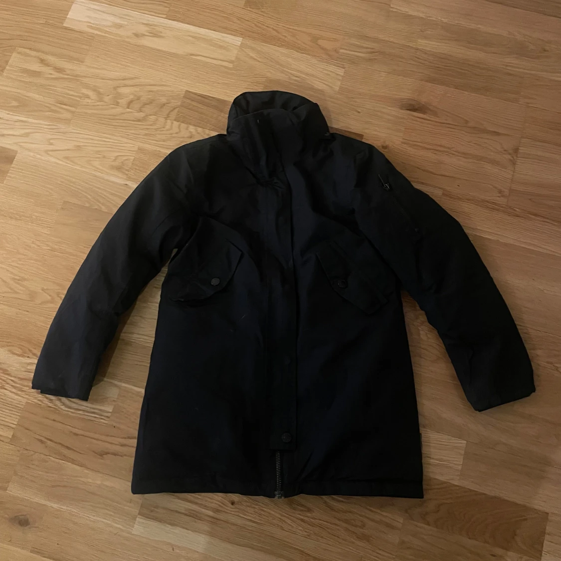 Snygg svart parkajacka med dragkedja och knappar framtill. Jackan har långa ärmar och praktiska fickor på bröstet. Perfekt för kyligare dagar.