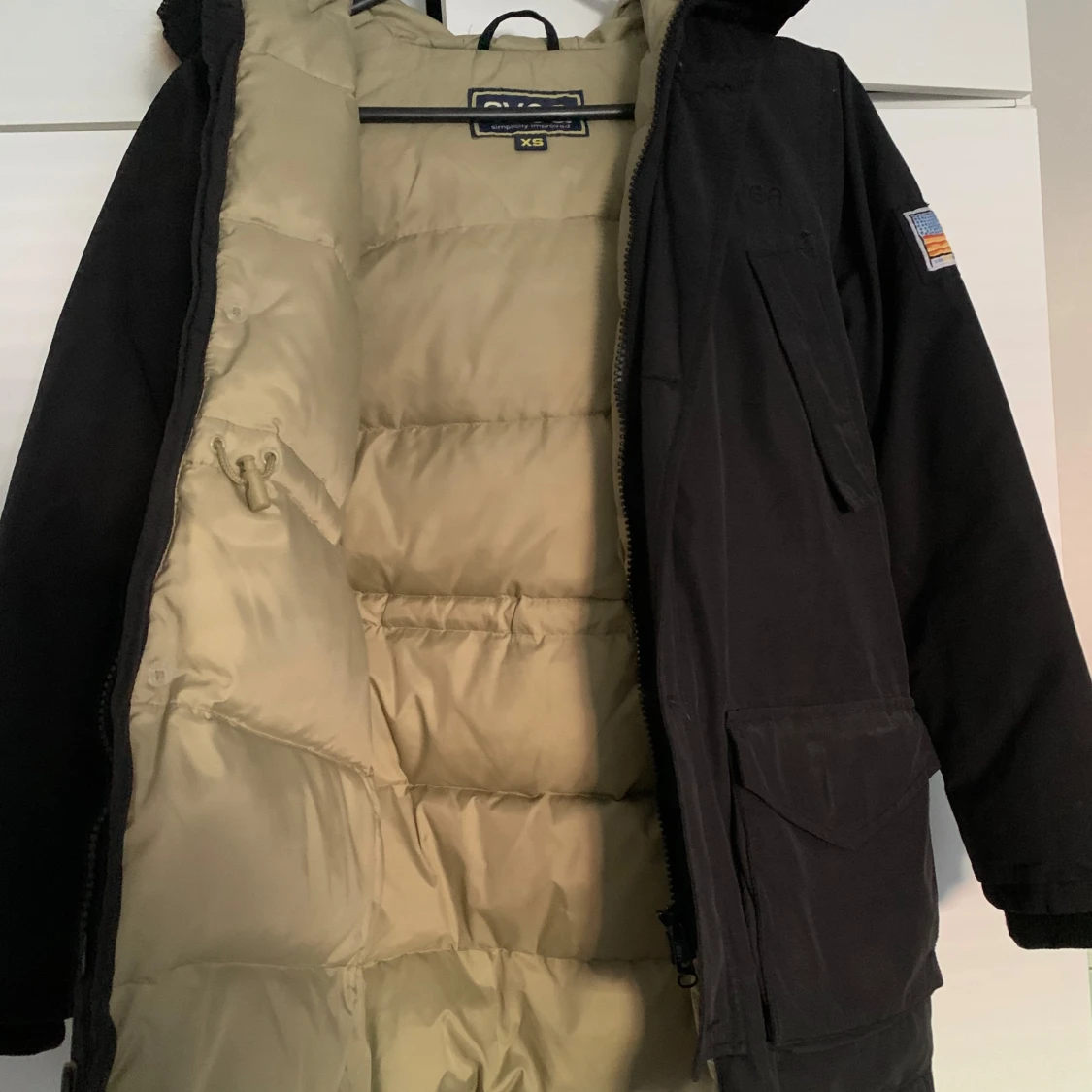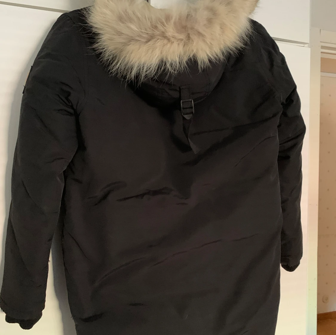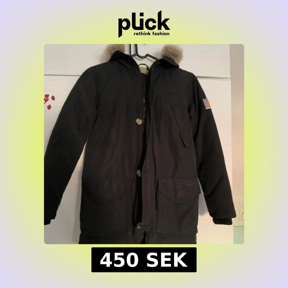 Svart parkajacka från Svea med huva och fuskpäls. Jackan har dragkedja, knappar och flera stora fickor framtill samt patch på ärmen. Fodrad insida i beige för extra värme.