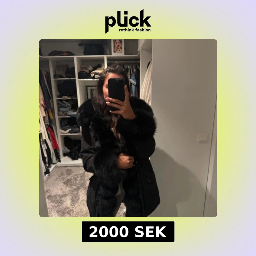 Säljer en svart parkajacka med stora fluffiga detaljer i riktig päls krage, ärmslut och framkant. Jackan har en klassisk parkamodell med lång ärm och snygg oversized känsla. Kan dras in i midjan, storlek S