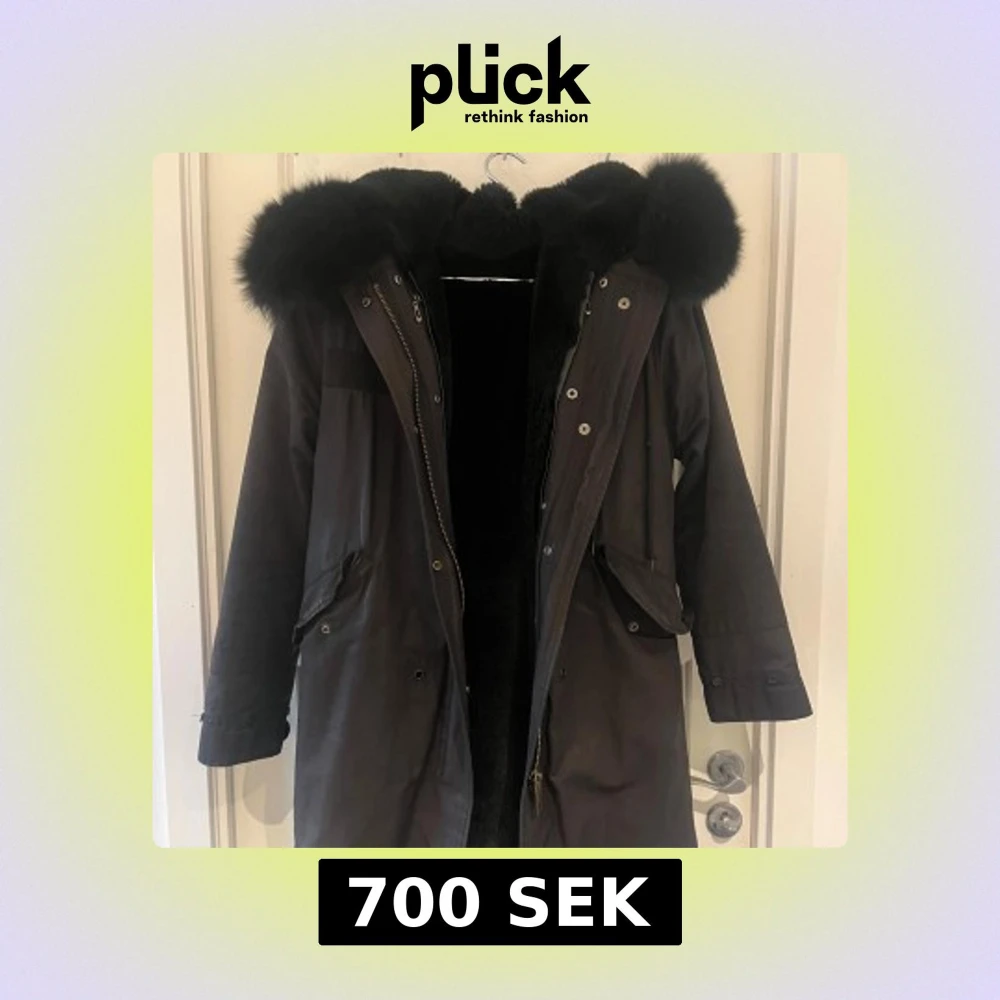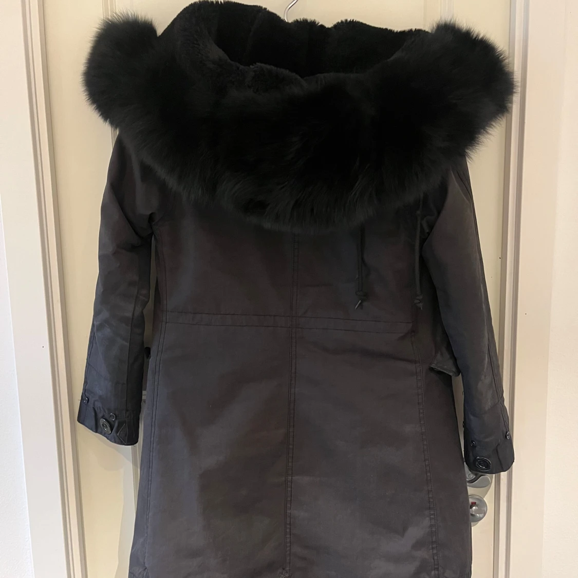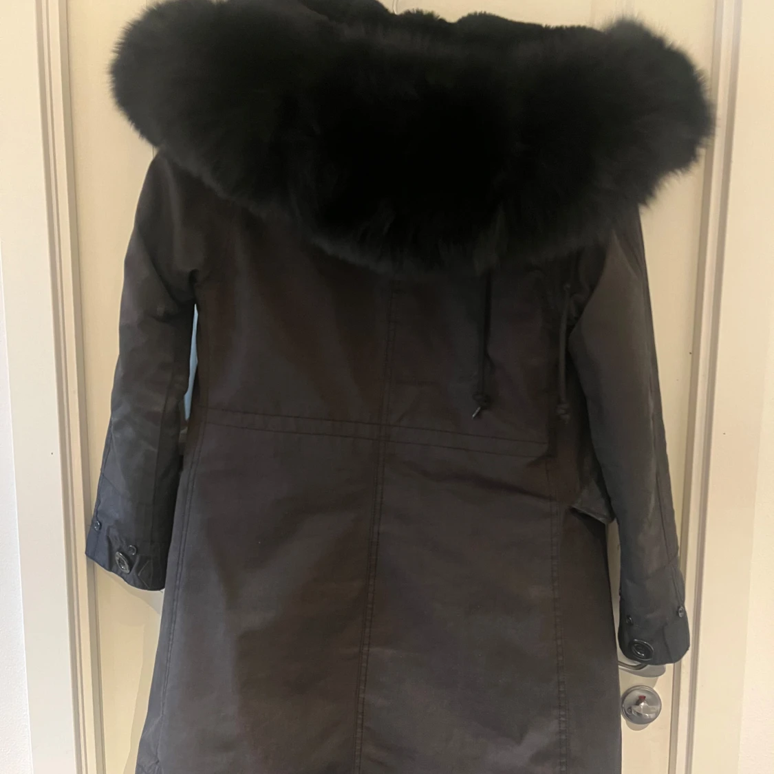 Säljer en svart parkajacka med stor, fluffig pälskantad huva och dragkedja framtill. Jackan har långa ärmar, fickor med lock och knappar samt justerbar midja. Perfekt för kalla dagar. I storlek S 🩷