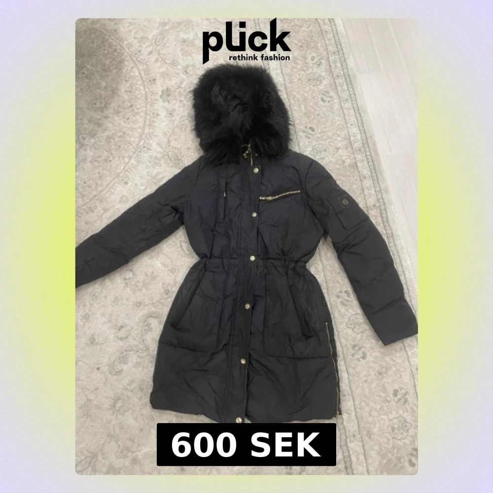 Svart parkas från Hollies med snygga gulddetaljer och dragkedjor. Jackan har en stor huva med fluffig äkta päls, markerad midja och flera fickor. Perfekt för kalla dagar och riktigt stilren look.