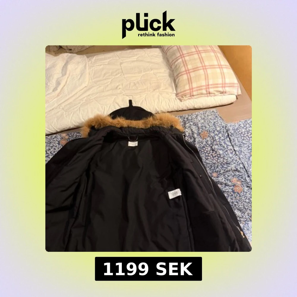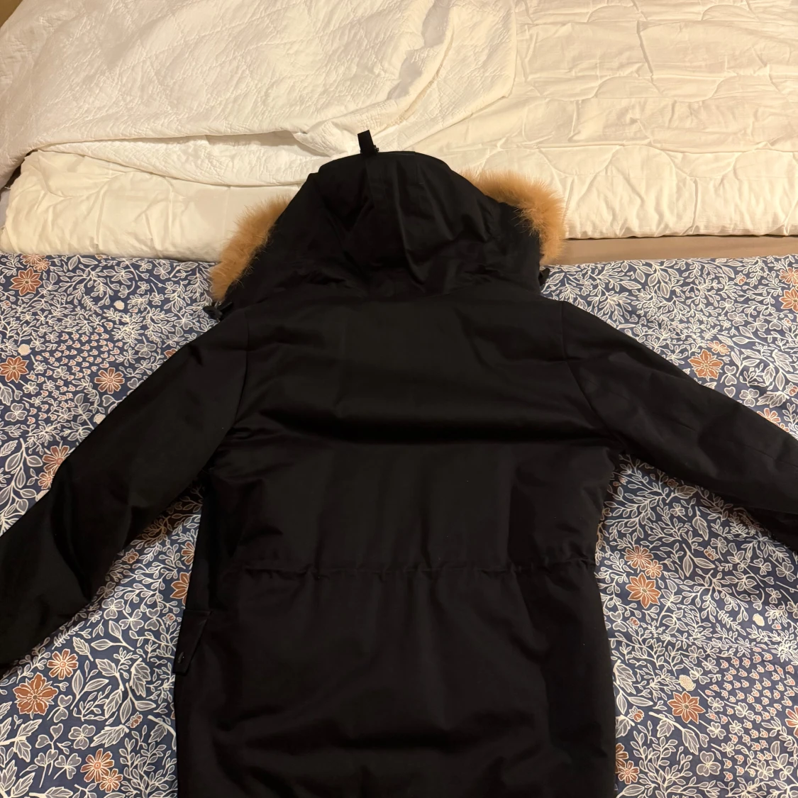 Svart parkas från Sandro Paris med huva och snygg fuskpäls i beige runt kragen. Jackan har dragkedja och knappar framtill, flera fickor och en kedjedetalj vid nacken. Perfekt för kalla dagar och riktigt stilren look.