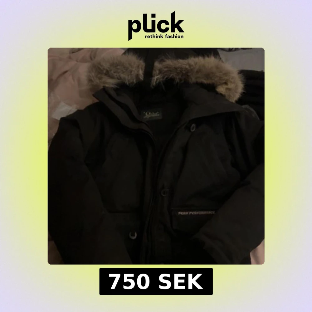 Svart vintage Peak Performance med huva och snygg fuskpäls runt kanten. Jackan har dragkedja och knappar framtill samt praktiska fickor. Perfekt för kalla dagar och riktigt skön passform.