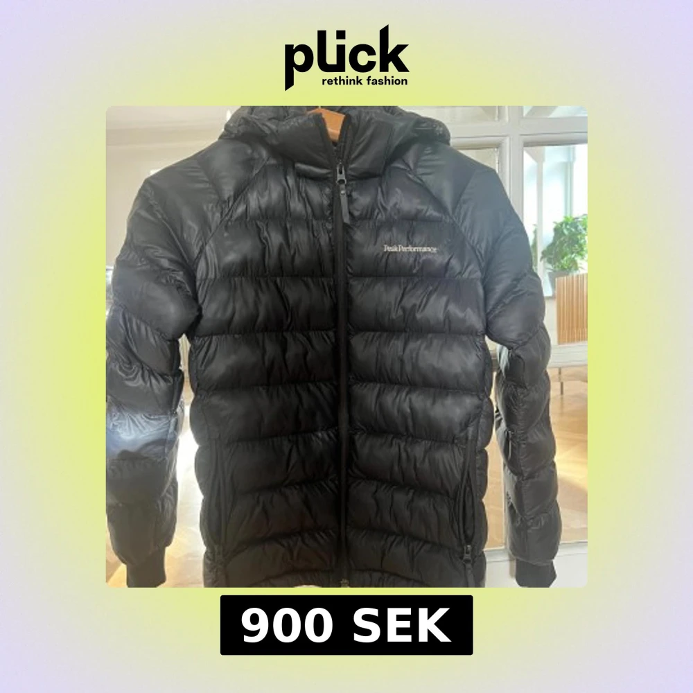 Svart dunjacka från Peak Performance med huva och diskret logga på bröstet. Jackan har quiltad design, dragkedja framtill och ribbade muddar vid ärmslut. Perfekt för kalla dagar och har en clean, sportig look som funkar till det mesta. Ett litet hål fast de syns inte när man har på sig den alls