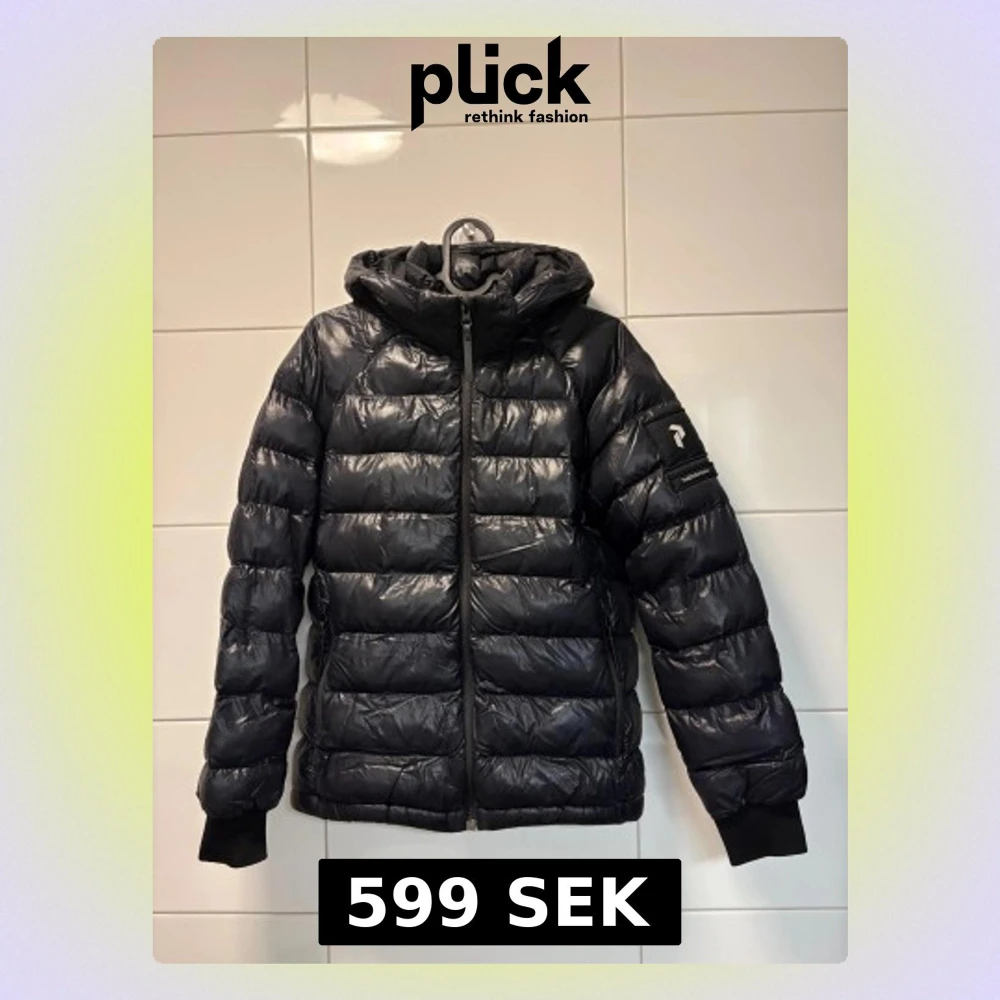 Svart dunjacka från Peak Performance med glansig finish. Jackan har huva, ribbade muddar och dragkedja framtill. Logotyp på vänster ärm. Perfekt för kalla dagar och har en clean look. Passar perfekt för dig som är mellan 158-164. Jackan har väldigt bra skick men dock har den tyvärr ett hål som är lappat men syns lite. Men annars är jackan väldigt fin. Säljer jackan väldigt billigt då den har ett hål och vill få sålt den snabbt!
