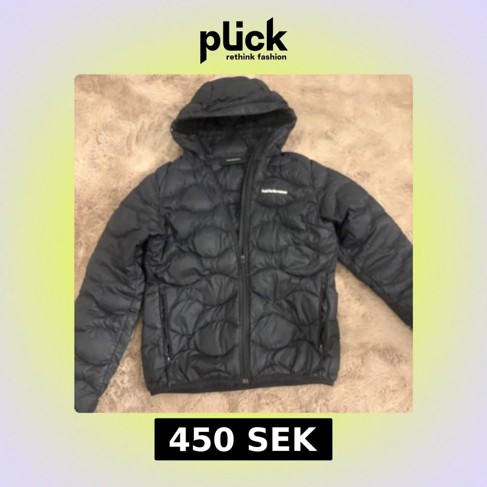 Peak Performance dunjacka i svart med huva och dragkedja. Den passar mig som brukar ha storlek S. Den har dock en lagning bakom armen men inget man märker, annars är den jätte bra skick