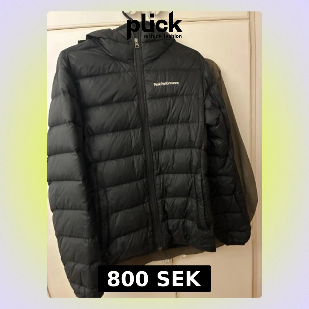 Svart dunjacka från Peak Performance i storlek S. Jackan har huva, dragkedja framtill och ett quiltat mönster. Perfekt för vintern då den är varm och skön! Priset kan diskuteras!
