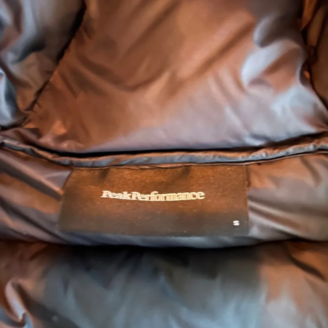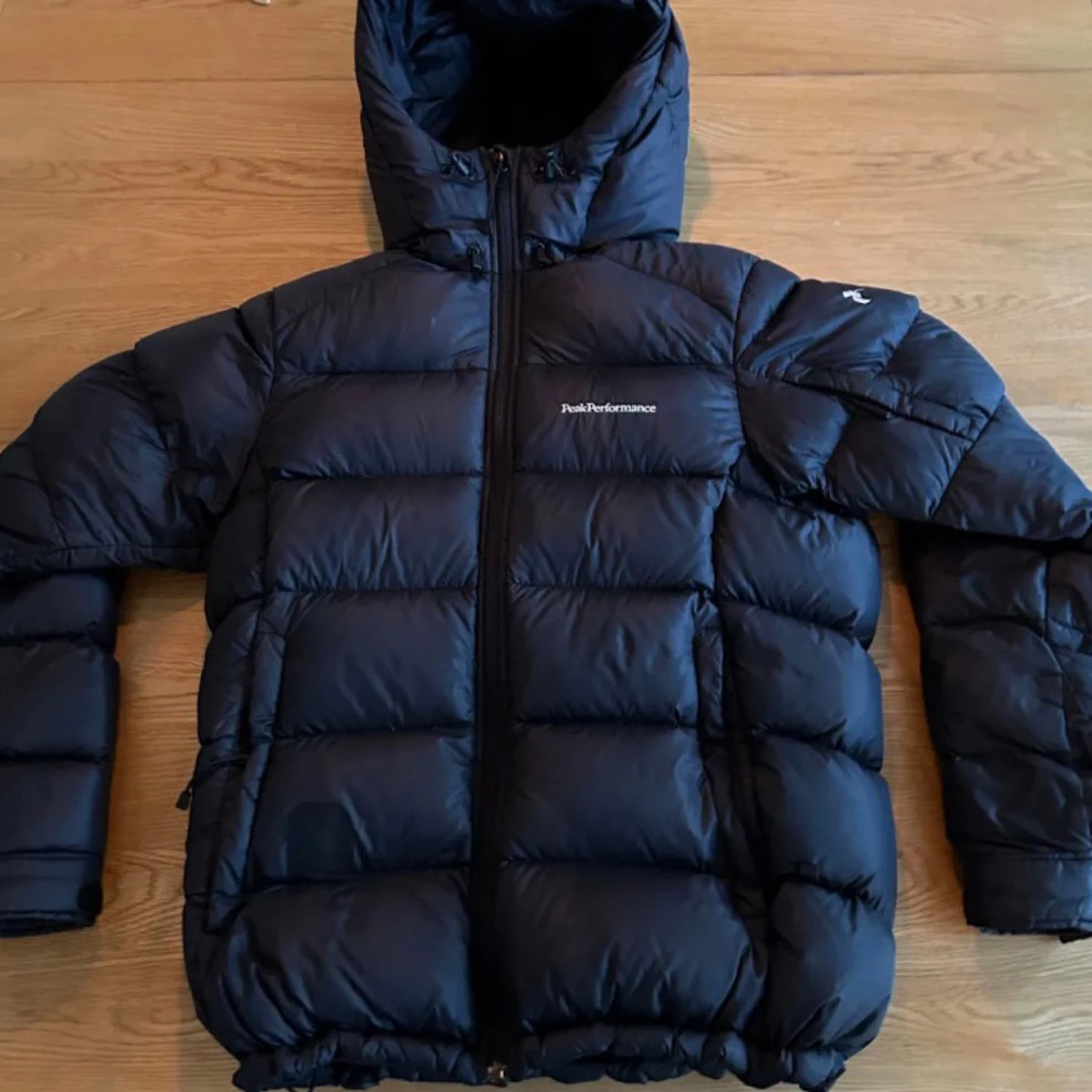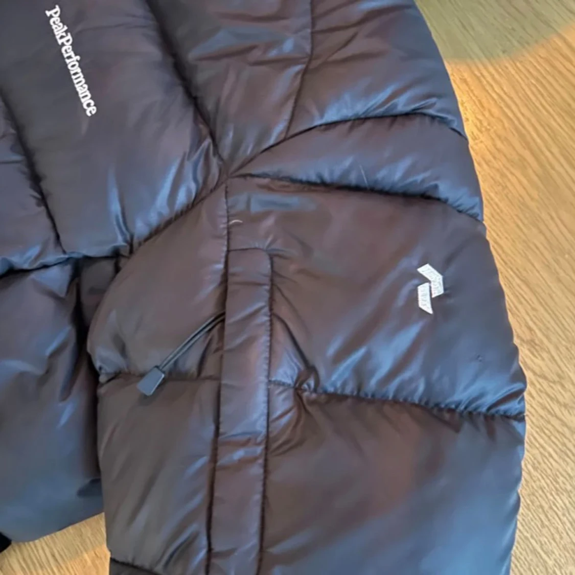 Svart pufferjacka från Peak Performance i storlek S. Jackan har huva, dragkedja framtill och diskret logga på bröstet och ärmen. Fylld med dun och har en quiltad design som ger en schysst volym. Perfekt för kalla dagar när du vill hålla stilen.